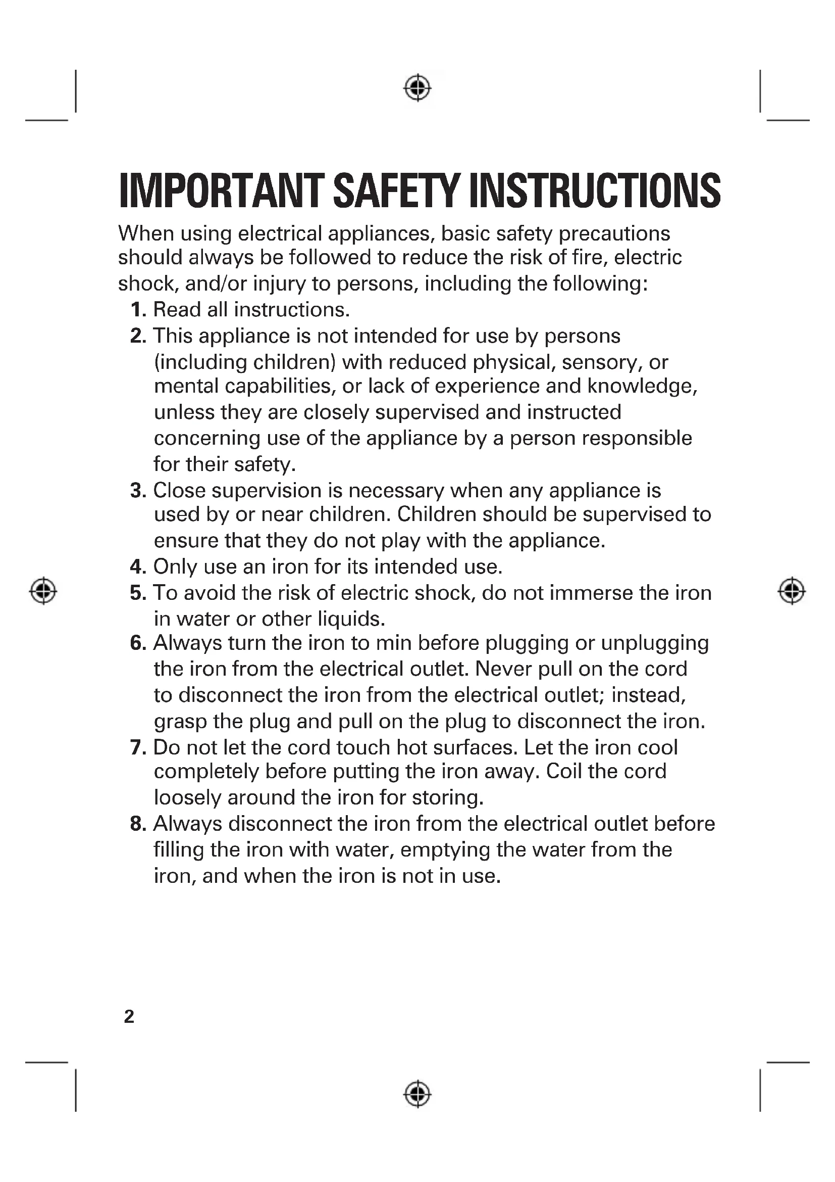 the iron from the electrical outlet. Never pull on the cord to disconnect the iron from the electrical outlet; instead, grasp the plug and pull on the plug to disconnect the iron.
