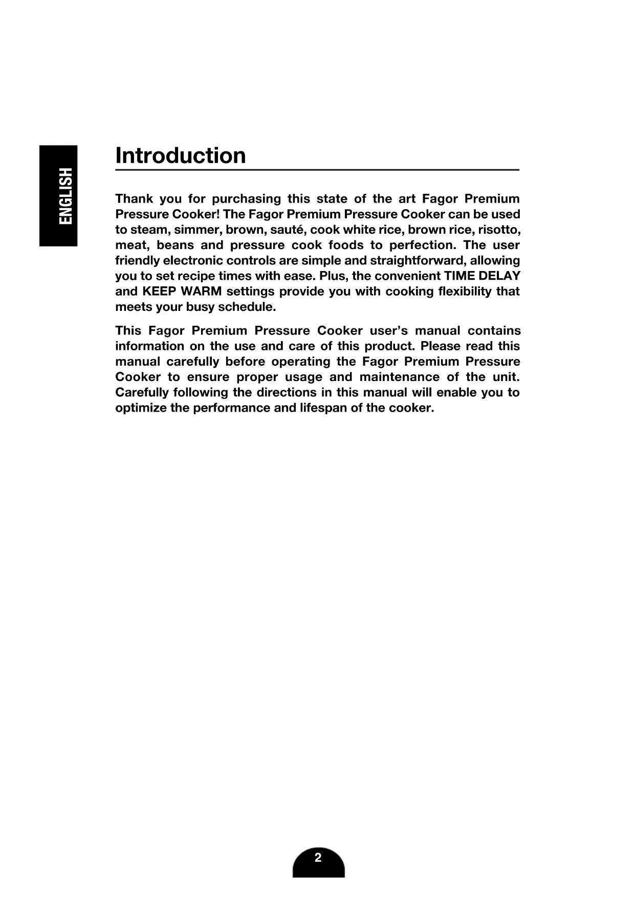 cooker before cooking.8 ENGLISH Operating Functions: Panel Programs and Functions Temperature/Timer Chart Cooking Function: Temperature: Preset Time: Timer: Keep Warm 165°F 30 minutes Up to 12 hours, 30 minute increments Steam 212°F 5 minutes 1-99 minutes, 1 minute increments Brown 356°F 30 minutes 1-30 minutes, 1 minute increments Sauté 284°F 30 minutes 1-30 minutes, 1 minute increments Simmer 200°F 30 minutes 1-120 minutes, 1 minute increments High Pressure 240°F-248°F 1 minute 1-99 minutes, 1 minute increments Low Pressure 226°F-230°F 1 minute 1-99 minutes, 1 minute increments Meat 200°F 20 minutes 1-99 minutes, 1 minute increments Beans 240°F 7 minutes 1-99 minutes, 1 minute increments White Rice 226°F-230°F 10 minutes 1-99 minutes, 1 minute increments Brown Rice 240°F-248°F 20 minutes 1-99 minutes, 1 minute increments Risotto 240°F-248°F 6 minutes 1-99 minutes, 1 minute increments9 ENGLISH