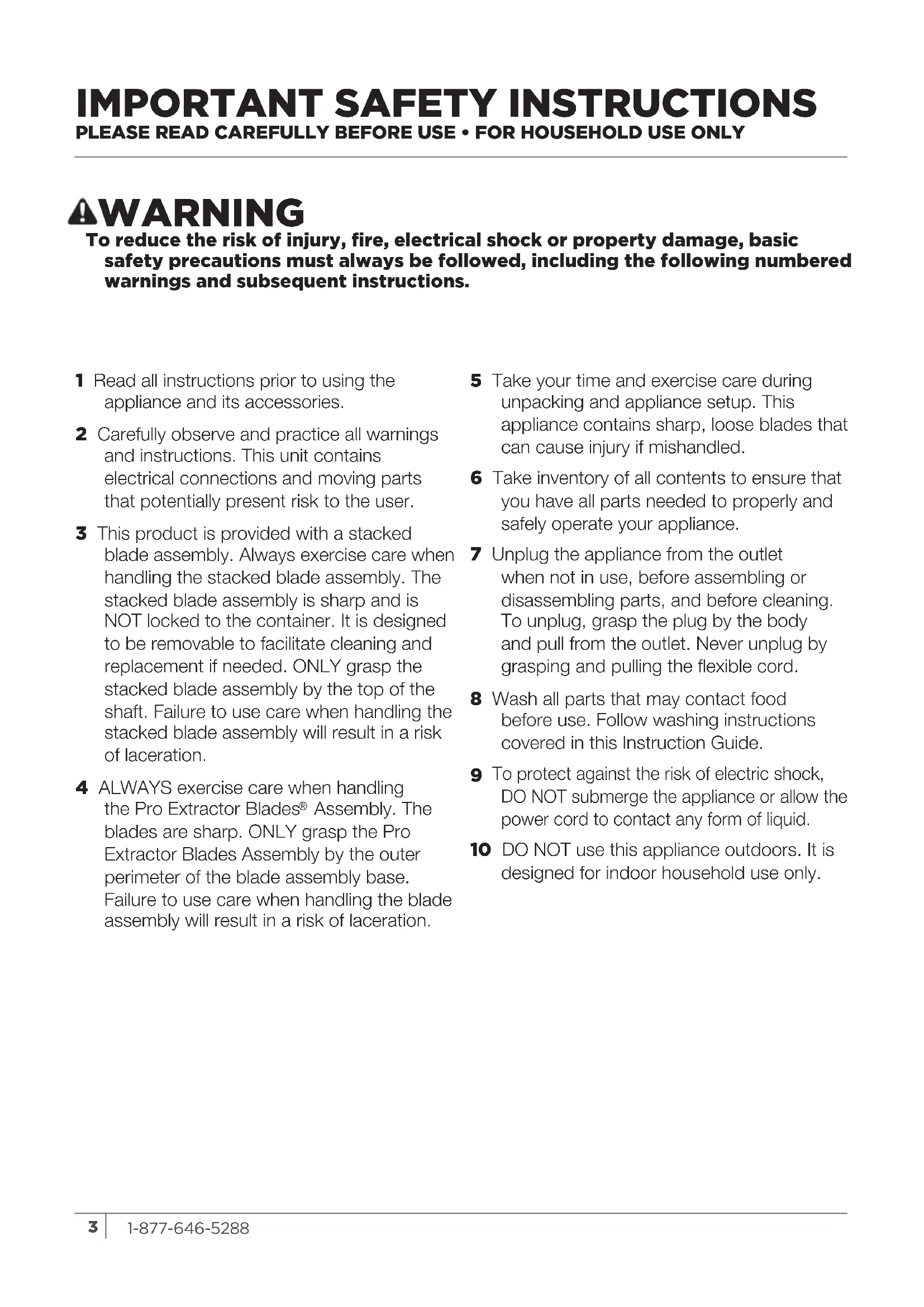 - Warranty 1-877-646-5288 1 Read all instructions prior to using the appliance and its accessories. 2 Carefully observe and practice all warnings and instructions. This unit contains electrical connections and moving parts that potentially present risk to the user. 3 This product is provided with a stacked blade assembly. Always exercise care when handling the stacked blade assembly. The stacked blade assembly is sharp and is NOT locked to the container. It is designed to be removable to facilitate cleaning and replacement if needed. ONLY grasp the stacked blade assembly by the top of the shaft. Failure to use care when handling the stacked blade assembly will result in a risk of laceration. 4 ALWAYS exercise care when handling the Pro Extractor Blades p. 223
