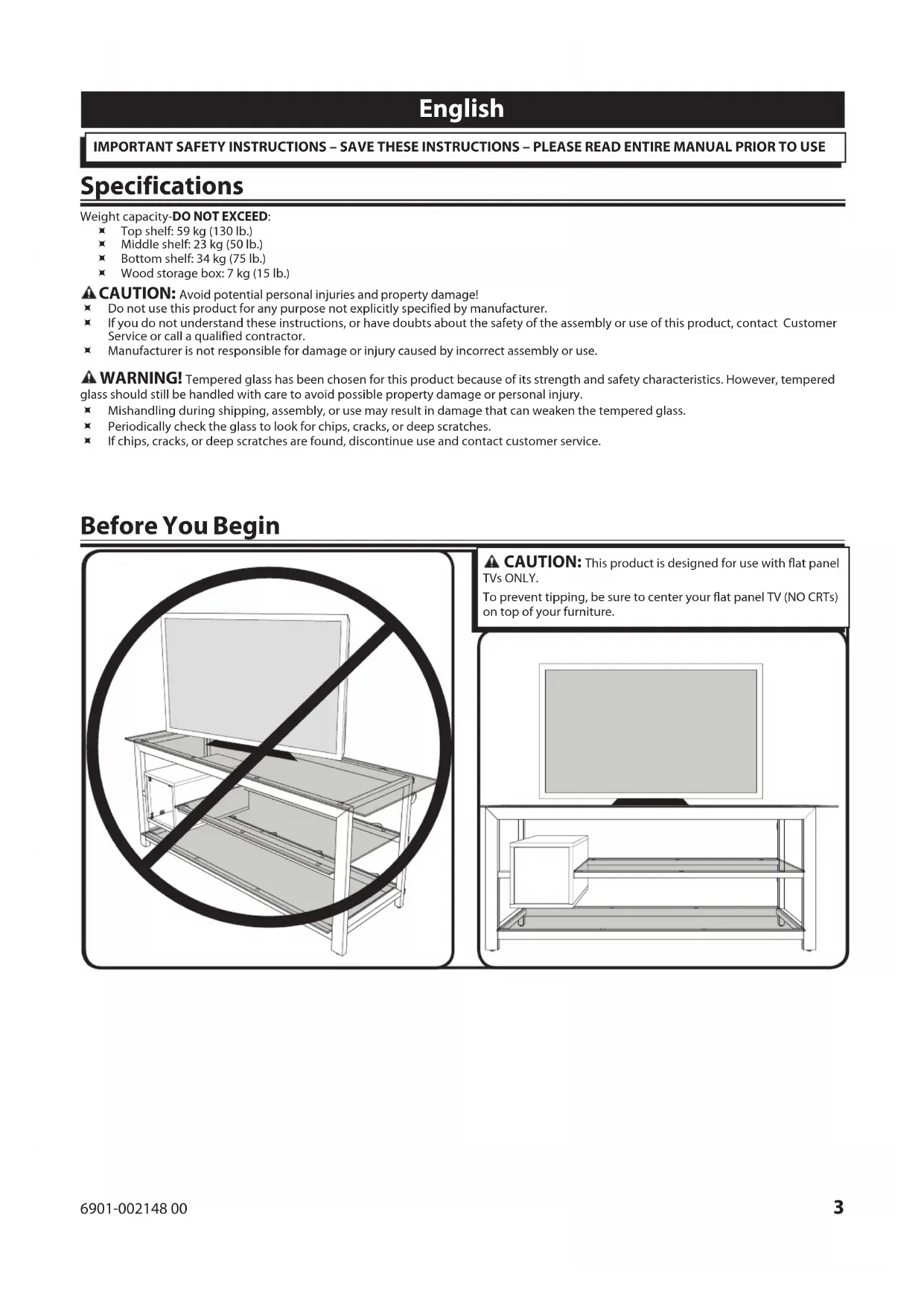 IMPORTANT SAFETY INSTRUCTIONS – SAVE THESE INSTRUCTIONS – PLEASE READ ENTIRE MANUAL PRIOR TO USE Specifications Weight capacity-DO NOT EXCEED: Ù Top shelf: 59 kg (130 lb.) Ù Middle shelf: 23 kg (50 lb.) Ù Bottom shelf: 34 kg (75 lb.) Ù Wood storage box: 7 kg (15 lb.) CAUTION: Avoid potential personal injuries and property damage! Ù Do not use this product for any purpose not explicitly specified by manufacturer. Ù If you do not understand these instructions, or have doubts about the safety of the assembly or use of this product, contact Customer Service or call a qualified contractor. Ù Manufacturer is not responsible for damage or injury caused by incorrect assembly or use. WARNING! Tempered glass has been chosen for this product because of its strength and safety characteristics. However, tempered glass should still be handled with care to avoid possible property damage or personal injury. Ù Mishandling during shipping, assembly, or use may result in damage that can weaken the tempered glass. Ù Periodically check the glass to look for chips, cracks, or deep scratches. Ù If chips, cracks, or deep scratches are found, discontinue use and contact customer service. English Before You Begin CAUTION: This product is designed for use with at panel TVs ONLY.To prevent tipping, be sure to center your at panel TV (NO CRTs) on top of your furniture.6901-002148 00)