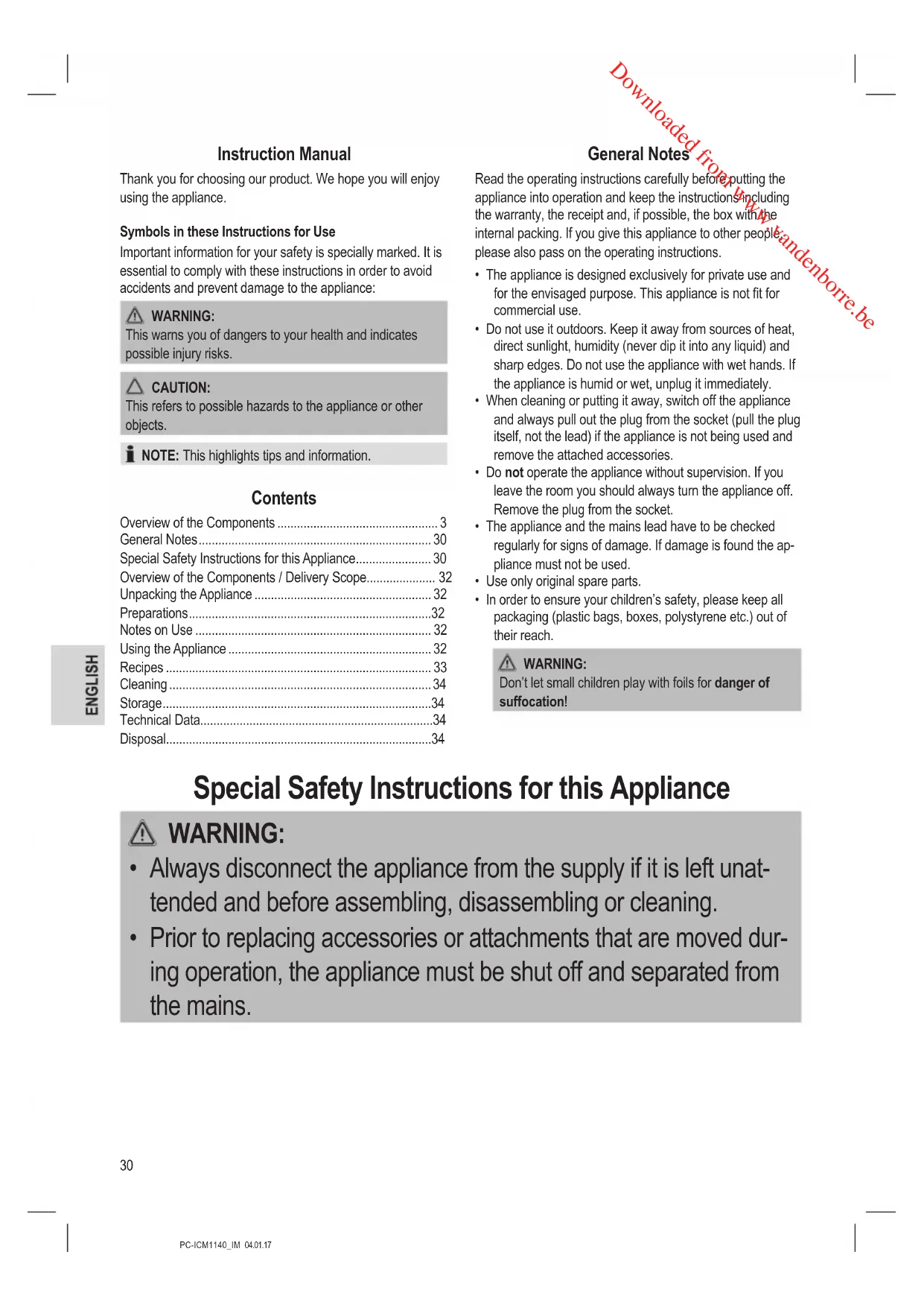 - Prior to replacing accessories or attachments that are moved dur- ing operation, the appliance must be shut off and separated from the mains. Downloaded from www.vandenborre.be31 PC-ICM1140_IM 04.01.17