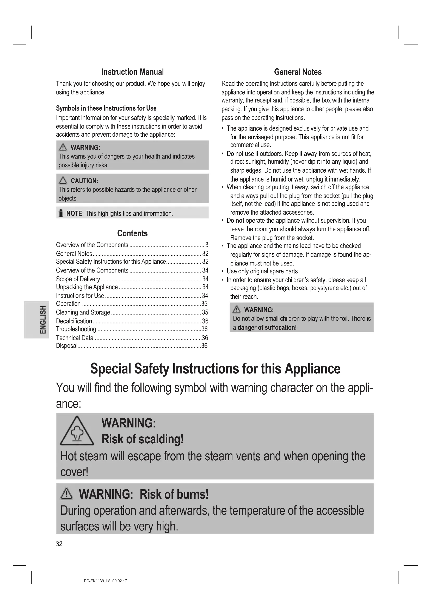 - Clean the lid, the egg holder, and the omelette / poaching insert in a rinsing bath. Dry all parts before storing the appliance.36 PC-EK1139_IM 09.02.17 Decalcication