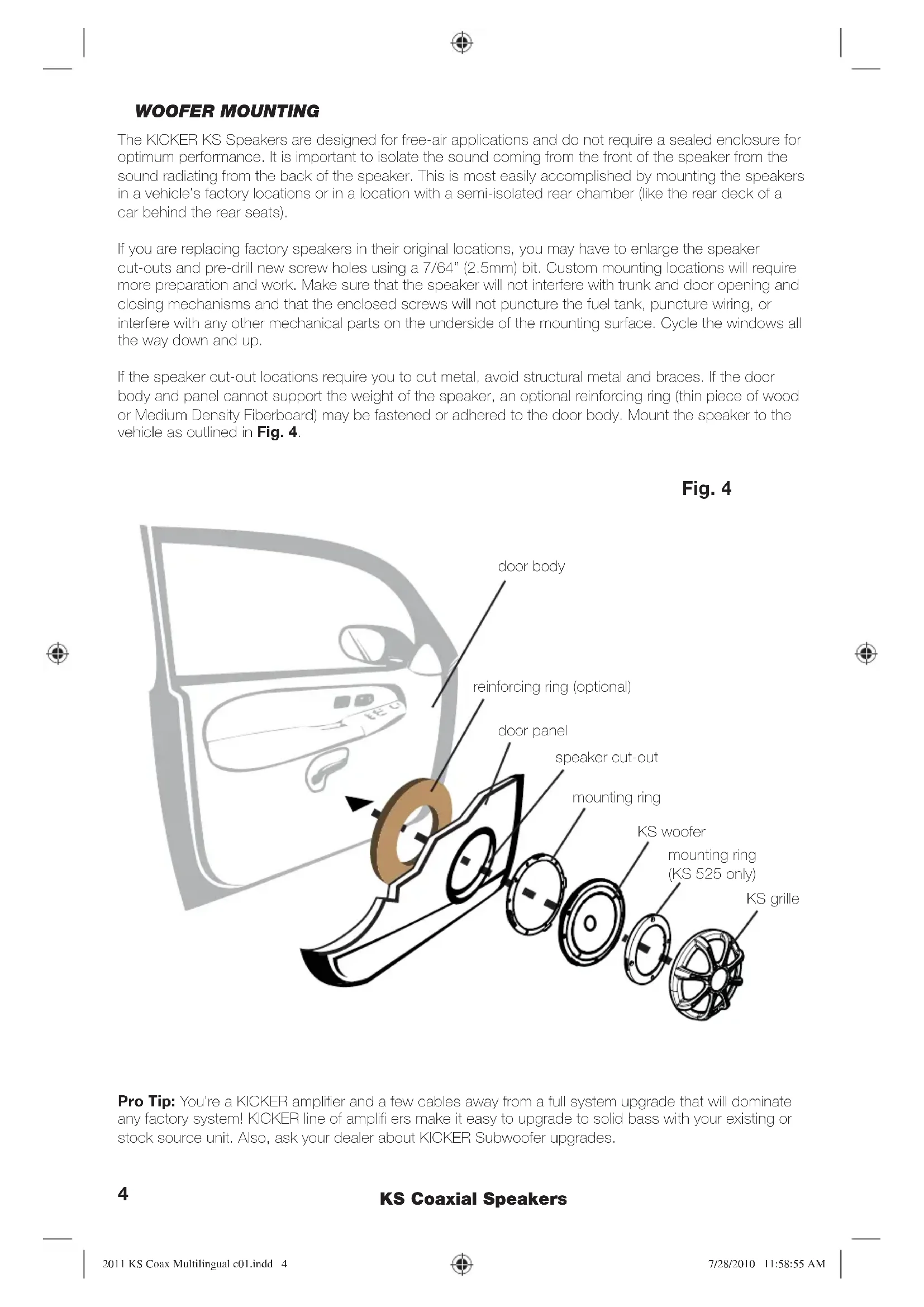 2011 KS Coax Multilingual c01.indd 22011 KS Coax Multilingual c01.indd 2 7/28/2010 11:58:54 AM7/28/2010 11:58:54 AM3 Model: KS35 KS40 KS46 KS410 KS525 KS60 KS65 KS68 KS69 KS693 Speaker Design 2 - Way 2 - Way 2 - Way 2 - Way 2 - Way 2 - Way 2 - Way 2 - Way 2 - Way 3 - Way Woofer Size, in (mm) 3 1/2 (89) 4 (100) 4x6 (100x160) 4x10 (100x250) 5 1/4 (130) 6 (160) 6 1/2 (165) 6x8 (150x200) 6x9 (150x230) 6x9 (150x230) Mid Size, in (mm) - - - - - - - - - 2 (50) Tweeter Size, in (mm) 1/2 (13) 1/2 (13) 1/2 (13) 1/2 (13) 3/4 (20) 3/4 (20) 3/4 (20) 3/4 (20) 1 (25) 3/4 (20) Rated Impedance, ohm 4 4 4 4 4 4 4 4 4 4 DC Resistance, ohm 3 3 3 3 3 3 3 3 3 3 Power Range, Watts RMS 6-20 6-30 6-30 6-35 6-45 6-65 6-65 6-60 6-90 6-100 Peak Power Handling, Watts 40 60 60 70 135 195 195 180 270 300 Sensitivity [SPLo], dB @ 1W, 1m 88 88 88 88 90 90 90 90 92 92 Effective Frequency Range, Hz 80-20k 60-20k 50-20k 45-20k 45-21k 43-21k 40-21k 45-21k 30-21k 30-21k Mounting Hole Diameter, in (mm) 3 3/16 (81) 3 11/16 (94) 3 1/2x5 3/4 (89x146) 3 7/8x9 5/16 (98x237) 4 9/16 (116) 5 (127) 5 5/8 (143) 5x7 (127x178) 6x8 9/16 (152x217) 6x8 9/16 (152x217) Top Mount Depth, in (mm) .31 (8) .42 (10.7) .22 (5.7) .23 (5.9) .57 (14.4) .83 (21.2) .73 (18.6) .01 (3.1) .57 (14.5) .91 (23.1) Bottom Mount Depth, in (mm) 1 9/16 (40) 1 3/16 (46) 1 3/16 (46) 2 7/16 (62) 2 (51) 1 15/16 (49) 2 1/8 (54) 2 3/8 (6) 3 3/16 (81) 3 3/16 (81) Tweeter Protrusion, in (mm) .09 (2.4) .09 (2.3) .06 (1.5) .05 (1.2) .15 (3.9) .47 (11.9) .48 (12.1) 0 0 .34 (8.6) Grilles No Yes No No Yes Yes Yes No Yes Yes Tweeter Magnet Material Neodymium Neodymium Neodymium Neodymium Neodymium Neodymium Neodymium Neodymium Neodymium Neodymium Tweeter Dome Material PEN (polyethylene naphthalate) PEN (polyethylene naphthalate) PEN (polyethylene naphthalate) PEN (polyethylene naphthalate) Titanium Titanium Titanium Titanium Titanium Titanium Tweeter Design Balanced dome Balanced dome Balanced dome Balanced dome Dome Dome Dome Dome Dome Dome Woofer Cone Material Polypropylene Polypropylene Polypropylene Polypropylene Polypropylene Polypropylene Polypropylene Polypropylene Polypropylene Polypropylene Woofer Surround Material Santoprene Santoprene Santoprene Santoprene Santoprene Santoprene Santoprene Santoprene Santoprene Santoprene PERFORMANCE 2011 KS Coax Multilingual c01.indd 32011 KS Coax Multilingual c01.indd 3 7/28/2010 11:58:55 AM7/28/2010 11:58:55 AM4 KS Coaxial Speakers WOOFER MOUNTING The KICKER KS Speakers are designed for free-air applications and do not require a sealed enclosure for optimum performance. It is important to isolate the sound coming from the front of the speaker from the sound radiating from the back of the speaker. This is most easily accomplished by mounting the speakers in a vehicle’s factory locations or in a location with a semi-isolated rear chamber (like the rear deck of a car behind the rear seats). If you are replacing factory speakers in their original locations, you may have to enlarge the speaker cut-outs and pre-drill new screw holes using a 7/64” (2.5mm) bit. Custom mounting locations will require more preparation and work. Make sure that the speaker will not interfere with trunk and door opening and closing mechanisms and that the enclosed screws will not puncture the fuel tank, puncture wiring, or interfere with any other mechanical parts on the underside of the mounting surface. Cycle the windows all the way down and up. If the speaker cut-out locations require you to cut metal, avoid structural metal and braces. If the door body and panel cannot support the weight of the speaker, an optional reinforcing ring (thin piece of wood or Medium Density Fiberboard) may be fastened or adhered to the door body. Mount the speaker to the vehicle as outlined in Fig. 4. Fig. 4 Pro Tip: You’re a KICKER amplifi er and a few cables away from a full system upgrade that will dominate any factory system! KICKER line of amplifi ers make it easy to upgrade to solid bass with your existing or stock source unit. Also, ask your dealer about KICKER Subwoofer upgrades. door body door panel speaker cut-out KS woofer mounting ring (KS 525 only) KS grille mounting ring reinforcing ring (optional) 2011 KS Coax Multilingual c01.indd 42011 KS Coax Multilingual c01.indd 4 7/28/2010 11:58:55 AM7/28/2010 11:58:55 AM5