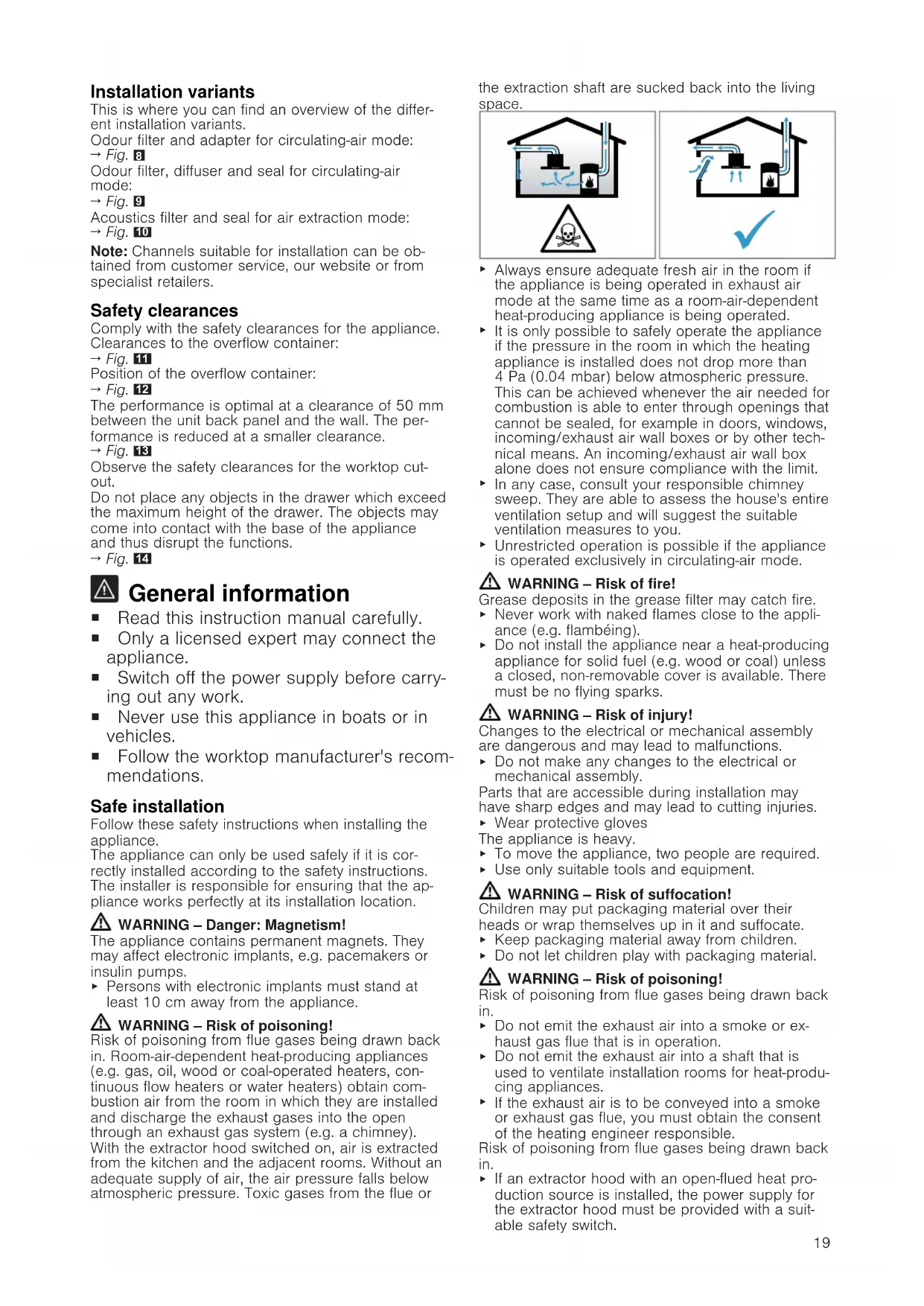 Persons with electronic implants must stand at least 10cm away from the appliance. WARNING‒Risk of poisoning! Risk of poisoning from flue gases being drawn back in. Room-air-dependent heat-producing appliances (e.g. gas, oil, wood or coal-operated heaters, con- tinuous flow heaters or water heaters) obtain com- bustion air from the room in which they are installed and discharge the exhaust gases into the open through an exhaust gas system (e.g. a chimney). With the extractor hood switched on, air is extracted from the kitchen and the adjacent rooms. Without an adequate supply of air, the air pressure falls below atmospheric pressure. Toxic gases from the flue or the extraction shaft are sucked back into the living space.