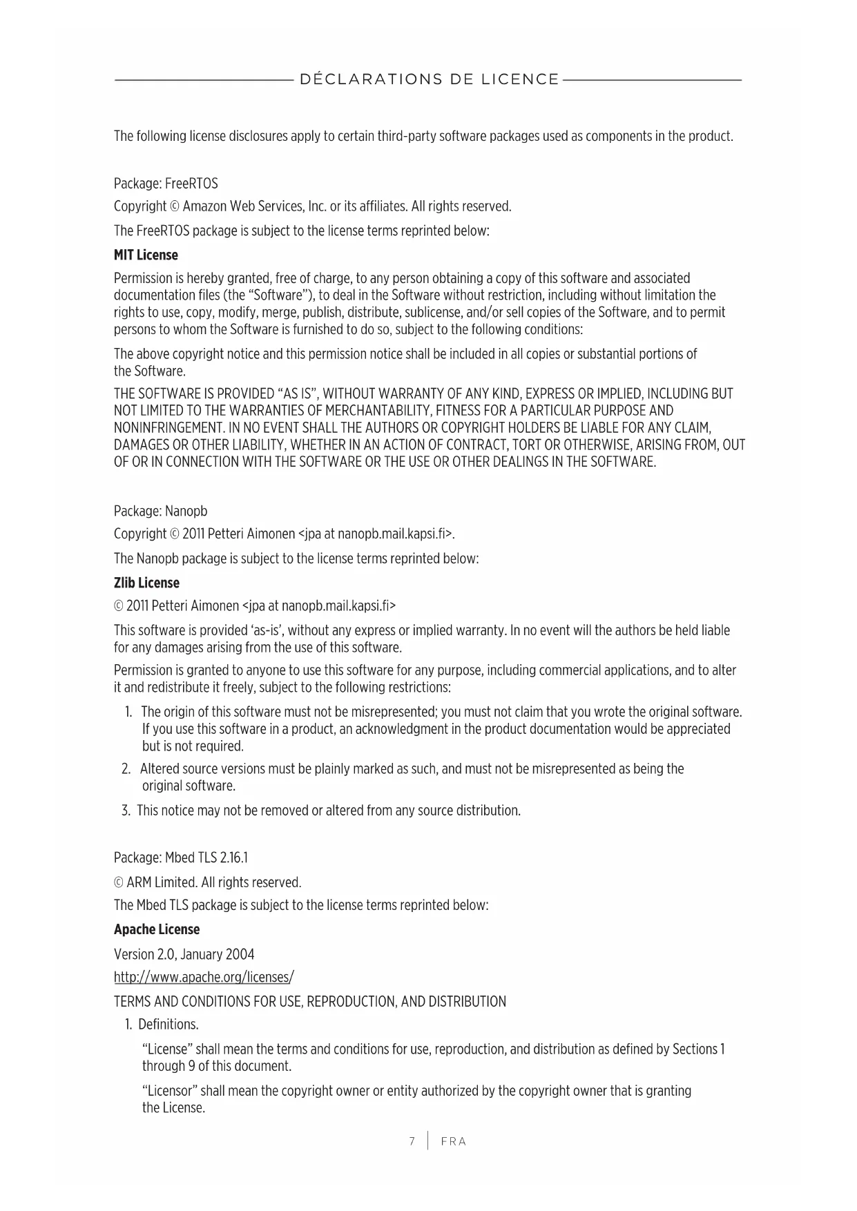 FRA The following license disclosures apply to certain third-party software packages used as components in the product. Package: FreeRTOS Copyright © Amazon Web Services, Inc. or its affiliates. All rights reserved. The FreeRTOS package is subject to the license terms reprinted below: MIT License Permission is hereby granted, free of charge, to any person obtaining a copy of this software and associated documentation files (the “Software”), to deal in the Software without restriction, including without limitation the rights to use, copy, modify, merge, publish, distribute, sublicense, and/or sell copies of the Software, and to permit persons to whom the Software is furnished to do so, subject to the following conditions: The above copyright notice and this permission notice shall be included in all copies or substantial portions of the Software. THE SOFTWARE IS PROVIDED “AS IS”, WITHOUT WARRANTY OF ANY KIND, EXPRESS OR IMPLIED, INCLUDING BUT NOT LIMITED TO THE WARRANTIES OF MERCHANTABILITY, FITNESS FOR A PARTICULAR PURPOSE AND NONINFRINGEMENT. IN NO EVENT SHALL THE AUTHORS OR COPYRIGHT HOLDERS BE LIABLE FOR ANY CLAIM, DAMAGES OR OTHER LIABILITY, WHETHER IN AN ACTION OF CONTRACT, TORT OR OTHERWISE, ARISING FROM, OUT OF OR IN CONNECTION WITH THE SOFTWARE OR THE USE OR OTHER DEALINGS IN THE SOFTWARE. Package: Nanopb Copyright © 2011 Petteri Aimonen <jpa at nanopb.mail.kapsi.fi>. The Nanopb package is subject to the license terms reprinted below: Zlib License © 2011 Petteri Aimonen <jpa at nanopb.mail.kapsi.fi> This software is provided ‘as-is’, without any express or implied warranty. In no event will the authors be held liable for any damages arising from the use of this software. Permission is granted to anyone to use this software for any purpose, including commercial applications, and to alter it and redistribute it freely, subject to the following restrictions: