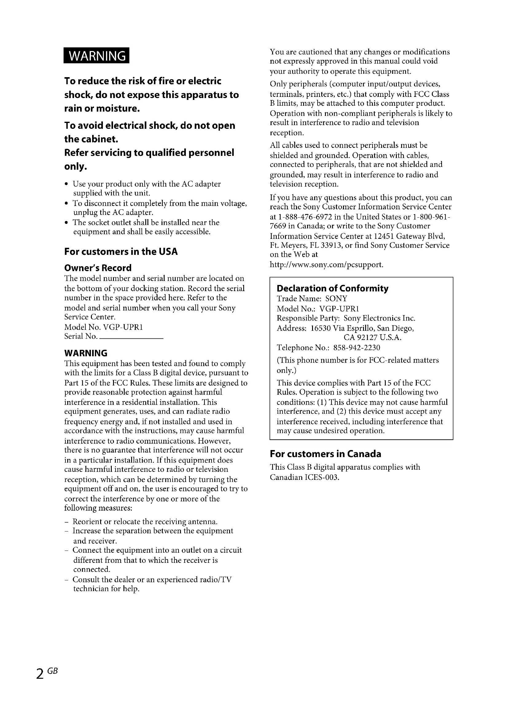 Use your product only with the AC adapter supplied with the unit. To disconnect it completely from the main voltage, unplug the AC adapter. The socket outlet shall be installed near the equipment and shall be easily accessible. For customers in the USA Owner’s Record The model number and serial number are located on the bottom of your docking station. Record the serial number in the space provided here. Refer to the model and serial number when you call your Sony Service Center.Model No. VGP-UPR1Serial No. WARNING This equipment has been tested and found to comply with the limits for a Class B digital device, pursuant to Part 15 of the FCC Rules. These limits are designed to provide reasonable protection against harmful interference in a residential installation. This equipment generates, uses, and can radiate radio frequency energy and, if not installed and used in accordance with the instructions, may cause harmful interference to radio communications. However, there is no guarantee that interference will not occur in a particular installation. If this equipment does cause harmful interference to radio or television reception, which can be determined by turning the equipment off and on, the user is encouraged to try to correct the interference by one or more of the following measures:– Reorient or relocate the receiving antenna.– Increase the separation between the equipment and receiver.– Connect the equipment into an outlet on a circuit different from that to which the receiver is connected.– Consult the dealer or an experienced radio/TV technician for help.You are cautioned that any changes or modifications not expressly approved in this manual could void your authority to operate this equipment.Only peripherals (computer input/output devices, terminals, printers, etc.) that comply with FCC Class B limits, may be attached to this computer product. Operation with non-compliant peripherals is likely to result in interference to radio and television reception.All cables used to connect peripherals must be shielded and grounded. Operation with cables, connected to peripherals, that are not shielded and grounded, may result in interference to radio and television reception.If you have any questions about this product, you can reach the Sony Customer Information Service Center at 1-888-476-6972 in the United States or 1-800-961-7669 in Canada; or write to the Sony Customer Information Service Center at 12451 Gateway Blvd, Ft. Meyers, FL 33913, or find Sony Customer Service on the Web athttp://www.sony.com/pcsupport. Declaration of Conformity Trade Name: SONYModel No.: VGP-UPR1Responsible Party: Sony Electronics Inc.Address: 16530 Via Esprillo, San Diego, CA 92127 U.S.A.Telephone No.: 858-942-2230(This phone number is for FCC-related matters only.)This device complies with Part 15 of the FCC Rules. Operation is subject to the following two conditions: (1) This device may not cause harmful interference, and (2) this device must accept any interference received, including interference that may cause undesired operation. For customers in Canada This Class B digital apparatus complies with Canadian ICES-003.VGP-UPR1 (JP/GB/FR/ES/CT/KR) 3-296-348-02(1)