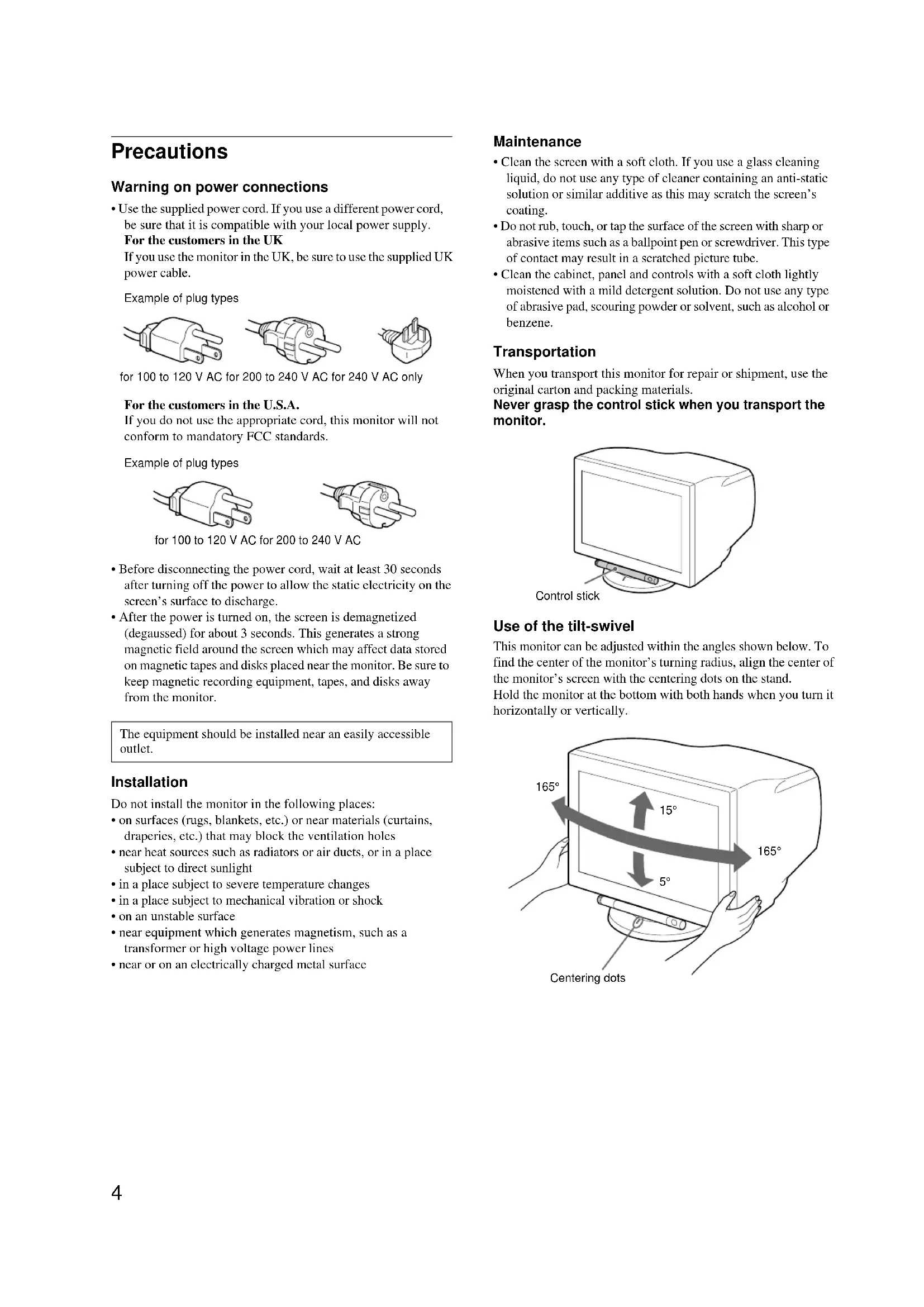 - Clean the cabinet, panel and controls with a soft cloth lightly moistened with a mild detergent solution. Do not use any type of abrasive pad, scouring powder or solvent, such as alcohol or benzene. Transportation When you transport this monitor for repair or shipment, use the original carton and packing materials. Never grasp the control stick when you transport the monitor. Use of the tilt-swivel This monitor can be adjusted within the angles shown below. To find the center of the monitor’s turning radius, align the center of the monitor’s screen with the centering dots on the stand. Hold the monitor at the bottom with both hands when you turn it horizontally or vertically. The equipment should be installed near an easily accessible outlet. Example of plug types for 100 to 120 V AC for 200 to 240 V AC for 240 V AC only Example of plug types for 100 to 120 V AC for 200 to 240 V AC Control stick 165°