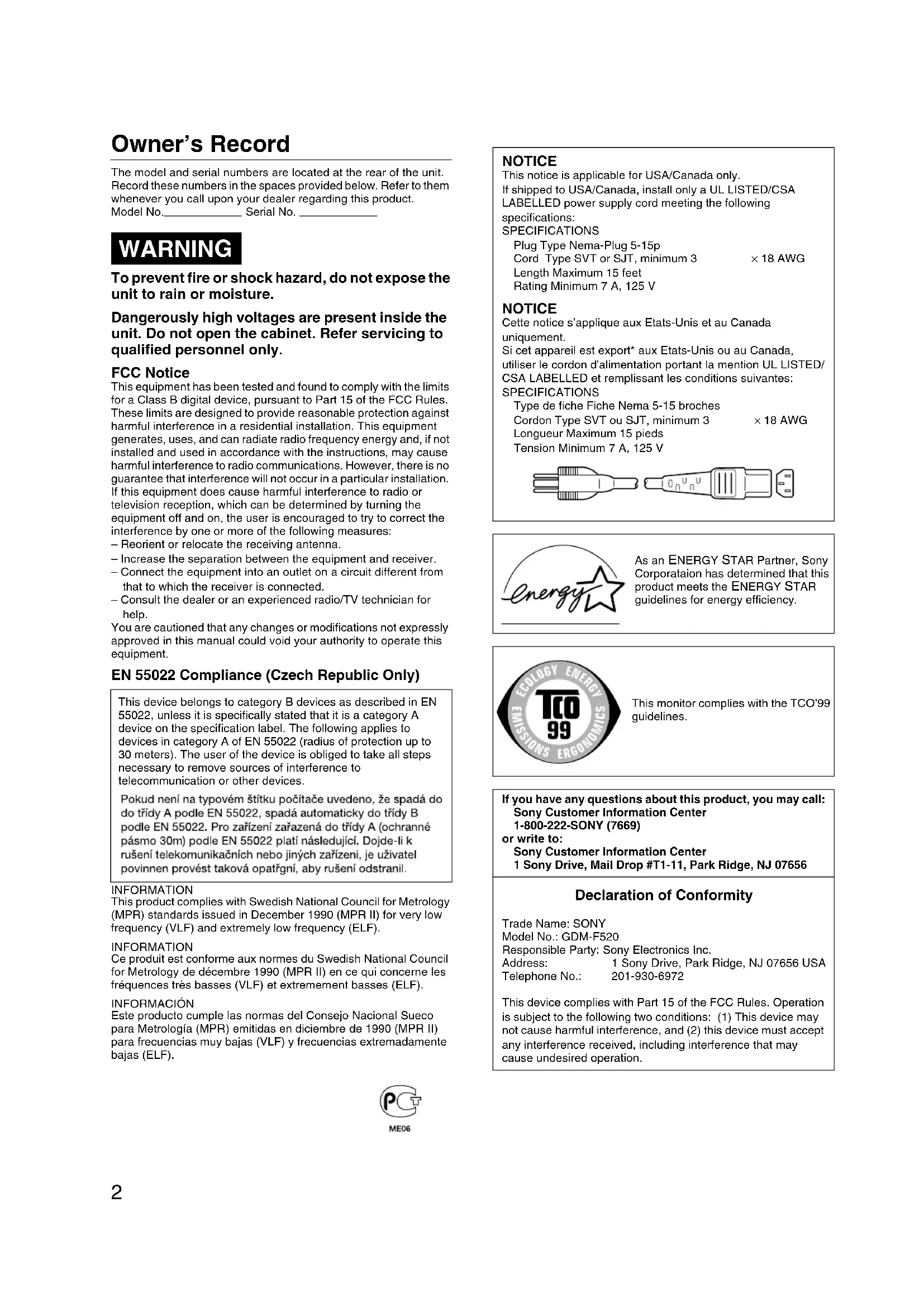 GDM-F5202 Owner’s Record The model and serial numbers are located at the rear of the unit. Record these numbers in the spaces provided below. Refer to them whenever you call upon your dealer regarding this product.Model No. Serial No. To prevent fire or shock hazard, do not expose the unit to rain or moisture. Dangerously high voltages are present inside the unit. Do not open the cabinet. Refer servicing to qualified personnel only. FCC Notice This equipment has been tested and found to comply with the limits for a Class B digital device, pursuant to Part 15 of the FCC Rules. These limits are designed to provide reasonable protection against harmful interference in a residential installation. This equipment generates, uses, and can radiate radio frequency energy and, if not installed and used in accordance with the instructions, may cause harmful interference to radio communications. However, there is no guarantee that interference will not occur in a particular installation. If this equipment does cause harmful interference to radio or television reception, which can be determined by turning the equipment off and on, the user is encouraged to try to correct the interference by one or more of the following measures:– Reorient or relocate the receiving antenna.– Increase the separation between the equipment and receiver.– Connect the equipment into an outlet on a circuit different from that to which the receiver is connected.– Consult the dealer or an experienced radio/TV technician for help.You are cautioned that any changes or modifications not expressly approved in this manual could void your authority to operate this equipment. EN 55022 Compliance (Czech Republic Only) INFORMATIONThis product complies with Swedish National Council for Metrology (MPR) standards issued in December 1990 (MPR II) for very low frequency (VLF) and extremely low frequency (ELF).INFORMATIONCe produit est conforme aux normes du Swedish National Council for Metrology de décembre 1990 (MPR II) en ce qui concerne les fréquences très basses (VLF) et extremement basses (ELF). INFORMACIÓNEste producto cumple las normas del Consejo Nacional Sueco para Metrología (MPR) emitidas en diciembre de 1990 (MPR II) para frecuencias muy bajas (VLF) y frecuencias extremadamente bajas (ELF). WARNING This device belongs to category B devices as described in EN 55022, unless it is specifically stated that it is a category A device on the specification label. The following applies to devices in category A of EN 55022 (radius of protection up to 30 meters). The user of the device is obliged to take all steps necessary to remove sources of interference to telecommunication or other devices. NOTICE This notice is applicable for USA/Canada only.If shipped to USA/Canada, install only a UL LISTED/CSA LABELLED power supply cord meeting the following specifications:SPECIFICATIONSPlug Type Nema-Plug 5-15pCord Type SVT or SJT, minimum 3 × 18 AWG Length Maximum 15 feetRating Minimum 7 A, 125 V NOTICE Cette notice s’applique aux Etats-Unis et au Canada uniquement.Si cet appareil est export* aux Etats-Unis ou au Canada, utiliser le cordon d’alimentation portant la mention UL LISTED/ CSA LABELLED et remplissant les conditions suivantes:SPECIFICATIONSType de fiche Fiche Nema 5-15 brochesCordon Type SVT ou SJT, minimum 3 × 18 AWG Longueur Maximum 15 piedsTension Minimum 7 A, 125 VAs an ENERGY STAR Partner, Sony Corporataion has determined that this product meets the ENERGY STAR guidelines for energy efficiency.This monitor complies with the TCO’99 guidelines.If you have any questions about this product, you may call:Sony Customer Information Center 1-800-222-SONY (7669)or write to:Sony Customer Information Center1 Sony Drive, Mail Drop #T1-11, Park Ridge, NJ 07656 Declaration of Conformity Trade Name: SONYModel No.: GDM-F520Responsible Party: Sony Electronics Inc.Address: 1 Sony Drive, Park Ridge, NJ 07656 USATelephone No.: 201-930-6972This device complies with Part 15 of the FCC Rules. Operation is subject to the following two conditions: (1) This device may not cause harmful interference, and (2) this device must accept any interference received, including interference that may cause undesired operation.GB