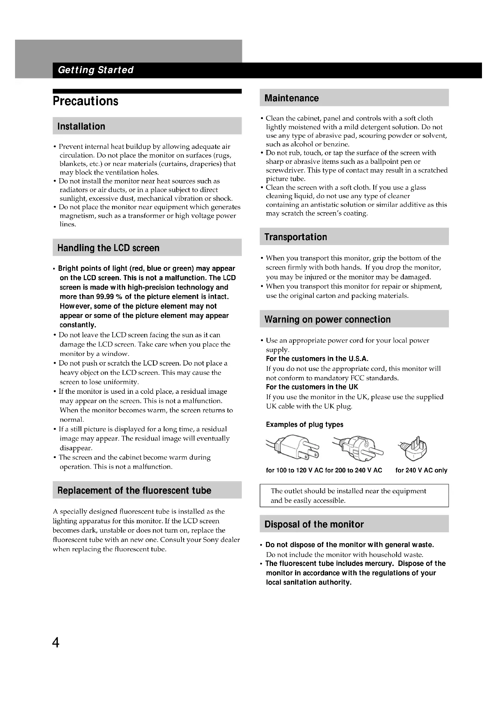 - The screen and the cabinet become warm during operation. This is not a malfunction. Replacement of the fluorescent tube A specially designed fluorescent tube is installed as the lighting apparatus for this monitor. If the LCD screen becomes dark, unstable or does not turn on, replace the fluorescent tube with an new one. Consult your Sony dealer when replacing the fluorescent tube. Getting Started for 100 to 120 V AC for 200 to 240 V AC for 240 V AC only Maintenance