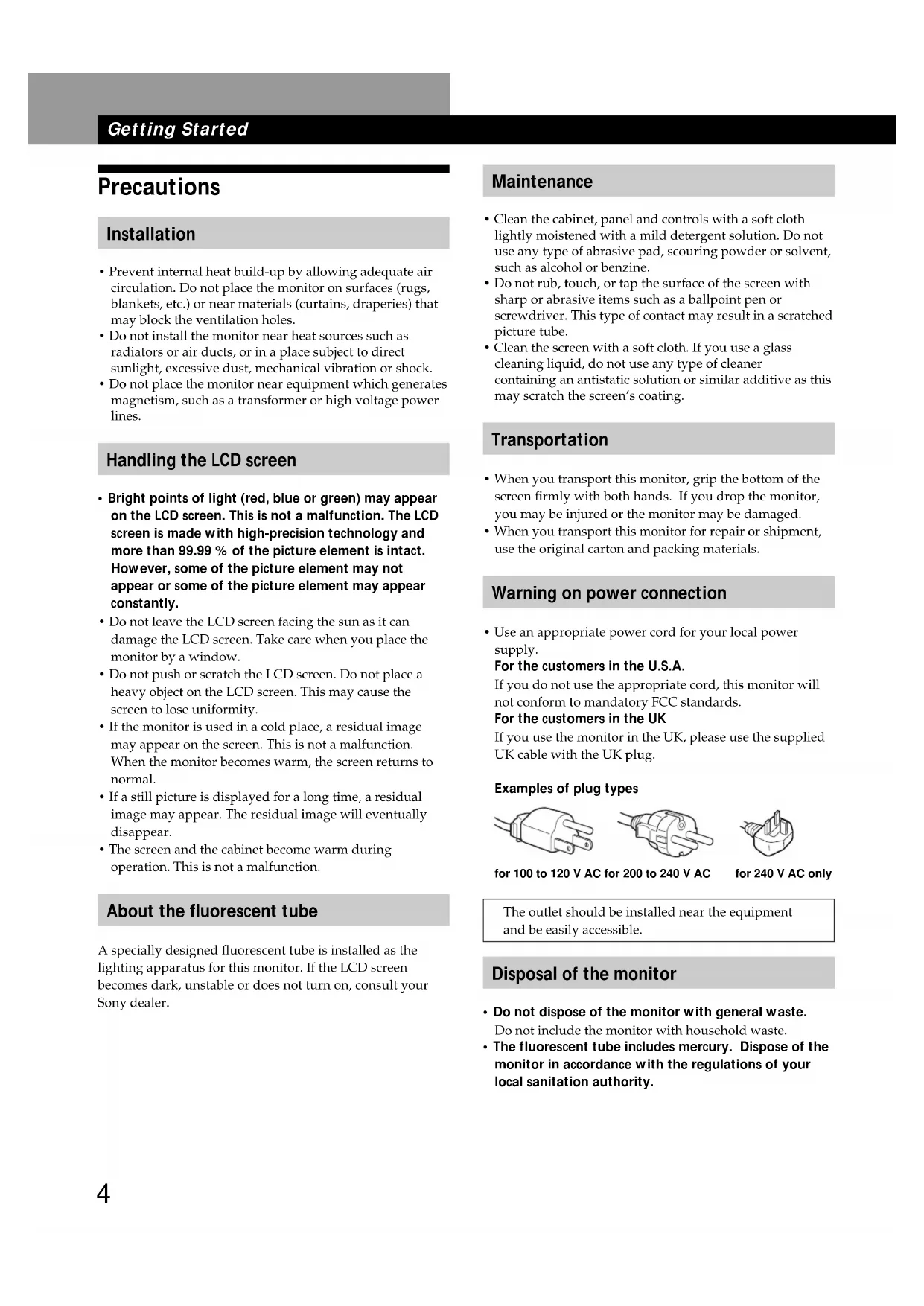 - The screen and the cabinet become warm during operation. This is not a malfunction. About the fluorescent tube A specially designed fluorescent tube is installed as the lighting apparatus for this monitor. If the LCD screen becomes dark, unstable or does not turn on, consult your Sony dealer. Getting Started for 100 to 120 V AC for 200 to 240 V AC for 240 V AC only Maintenance