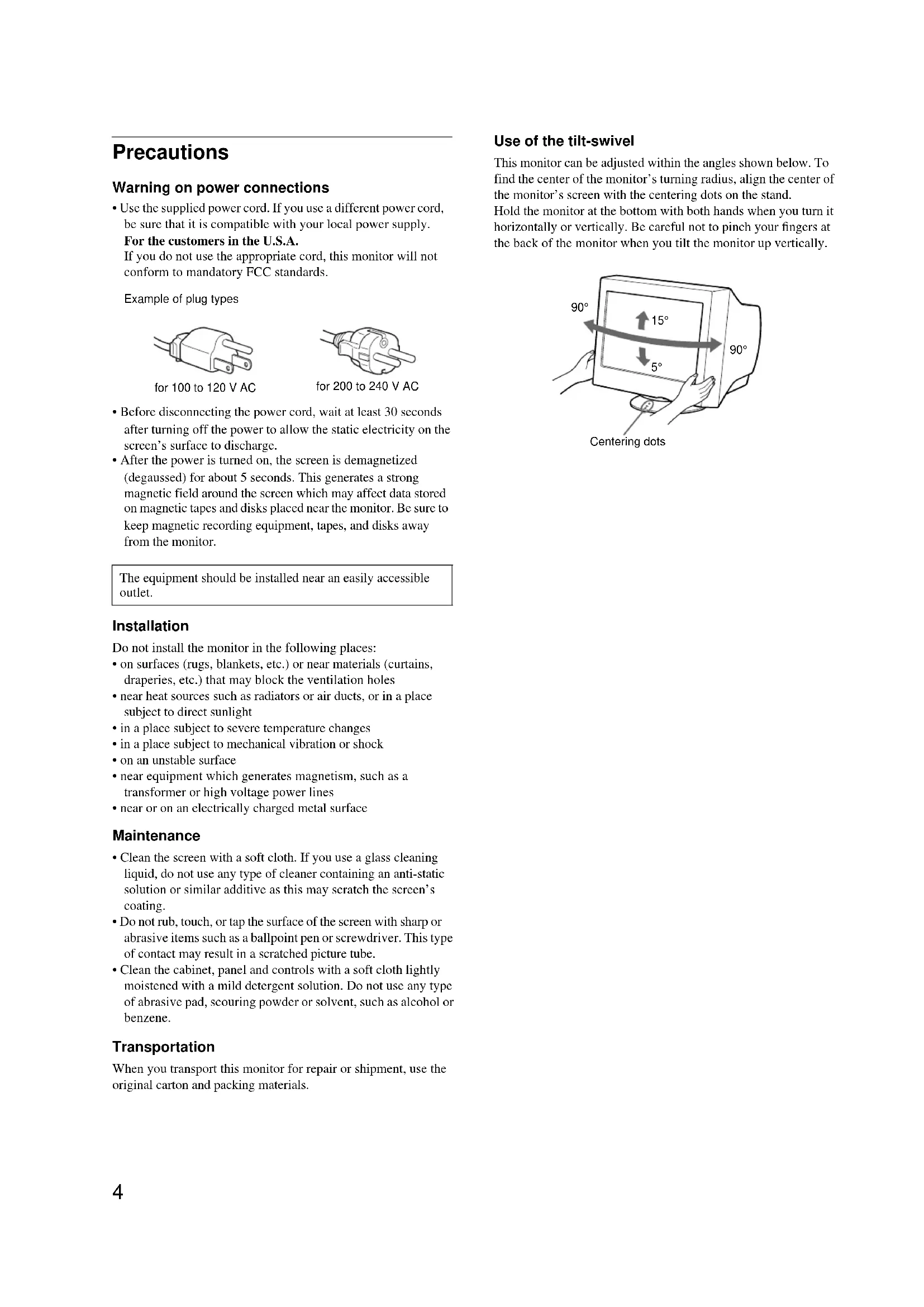 - Clean the cabinet, panel and controls with a soft cloth lightly moistened with a mild detergent solution. Do not use any type of abrasive pad, scouring powder or solvent, such as alcohol or benzene. Transportation When you transport this monitor for repair or shipment, use the original carton and packing materials. Use of the tilt-swivel This monitor can be adjusted within the angles shown below. To find the center of the monitor’s turning radius, align the center of the monitor’s screen with the centering dots on the stand. Hold the monitor at the bottom with both hands when you turn it horizontally or vertically. Be careful not to pinch your fingers at the back of the monitor when you tilt the monitor up vertically. The equipment should be installed near an easily accessible outlet. Example of plug types for 100 to 120 V AC for 200 to 240 V AC 90°