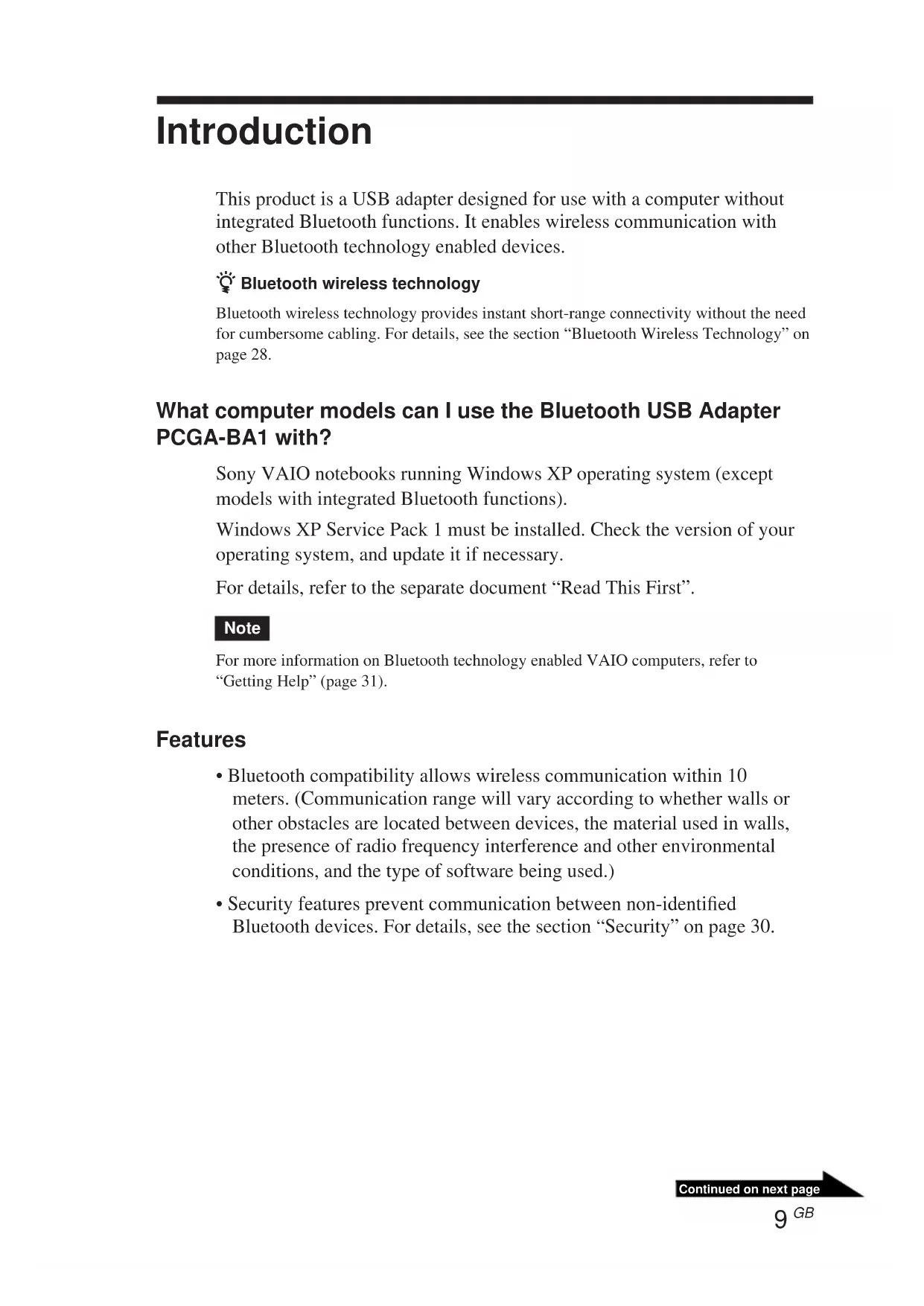 Continued on next page Introduction This product is a USB adapter designed for use with a computer without integrated Bluetooth functions. It enables wireless communication with other Bluetooth technology enabled devices. z Bluetooth wireless technology Bluetooth wireless technology provides instant short-range connectivity without the needfor cumbersome cabling. For details, see the section “Bluetooth Wireless Technology” onpage 28. What computer models can I use the Bluetooth USB Adapter PCGA-BA1 with? Sony VAIO notebooks running Windows XP operating system (except models with integrated Bluetooth functions). Windows XP Service Pack 1 must be installed. Check the version of your operating system, and update it if necessary. For details, refer to the separate document “Read This First”. Note For more information on Bluetooth technology enabled VAIO computers, refer to“Getting Help” (page 31). Features