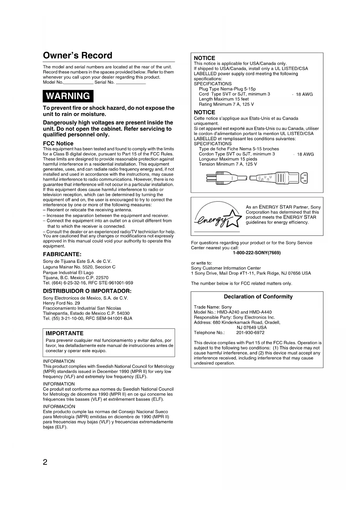 USER MANUAL HMDA240R SONY