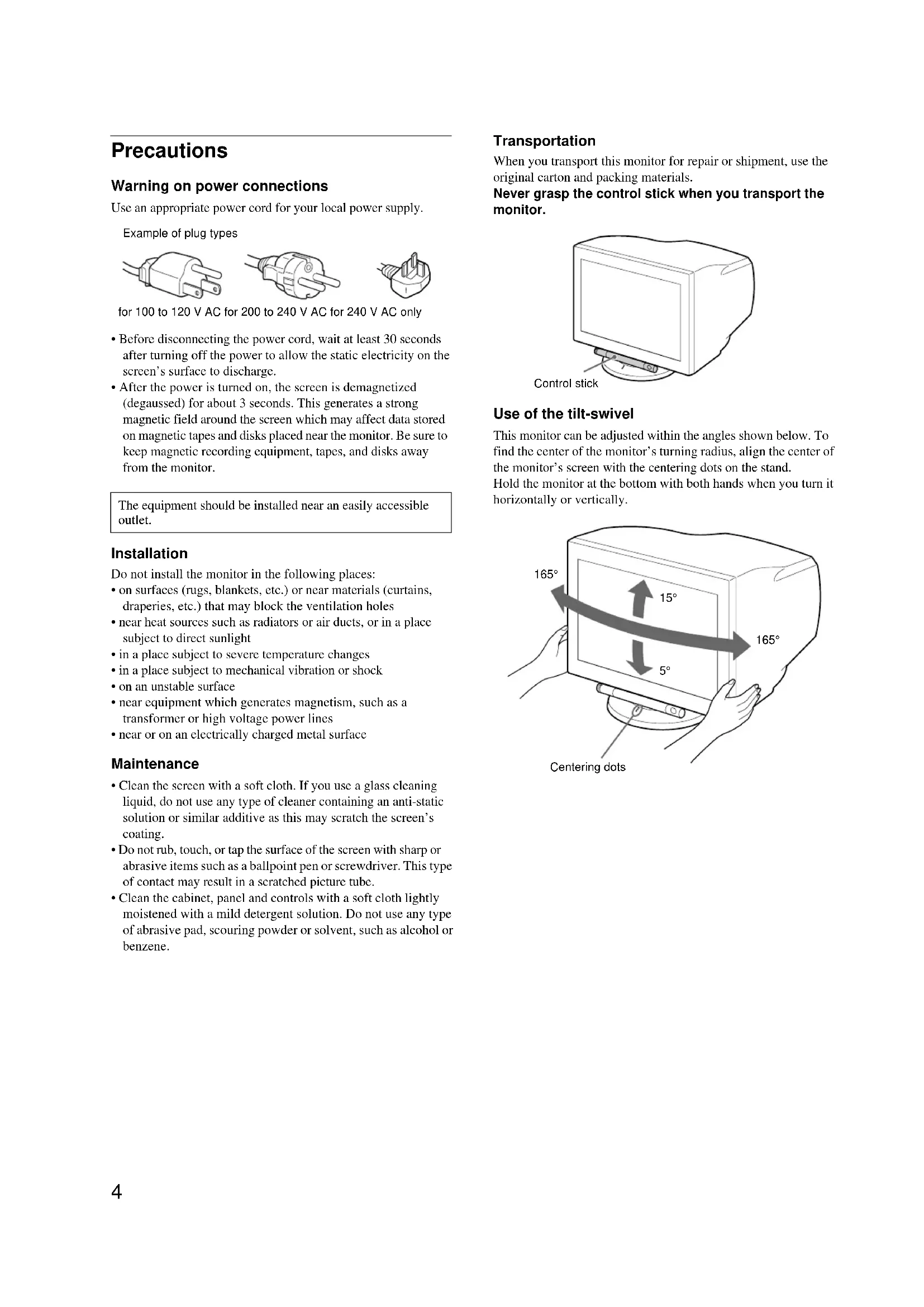 - Clean the cabinet, panel and controls with a soft cloth lightly moistened with a mild detergent solution. Do not use any type of abrasive pad, scouring powder or solvent, such as alcohol or benzene. Transportation When you transport this monitor for repair or shipment, use the original carton and packing materials. Never grasp the control stick when you transport the monitor. Use of the tilt-swivel This monitor can be adjusted within the angles shown below. To find the center of the monitor’s turning radius, align the center of the monitor’s screen with the centering dots on the stand. Hold the monitor at the bottom with both hands when you turn it horizontally or vertically. The equipment should be installed near an easily accessible outlet. Example of plug types for 100 to 120 V AC for 200 to 240 V AC for 240 V AC only Control stick 165°
