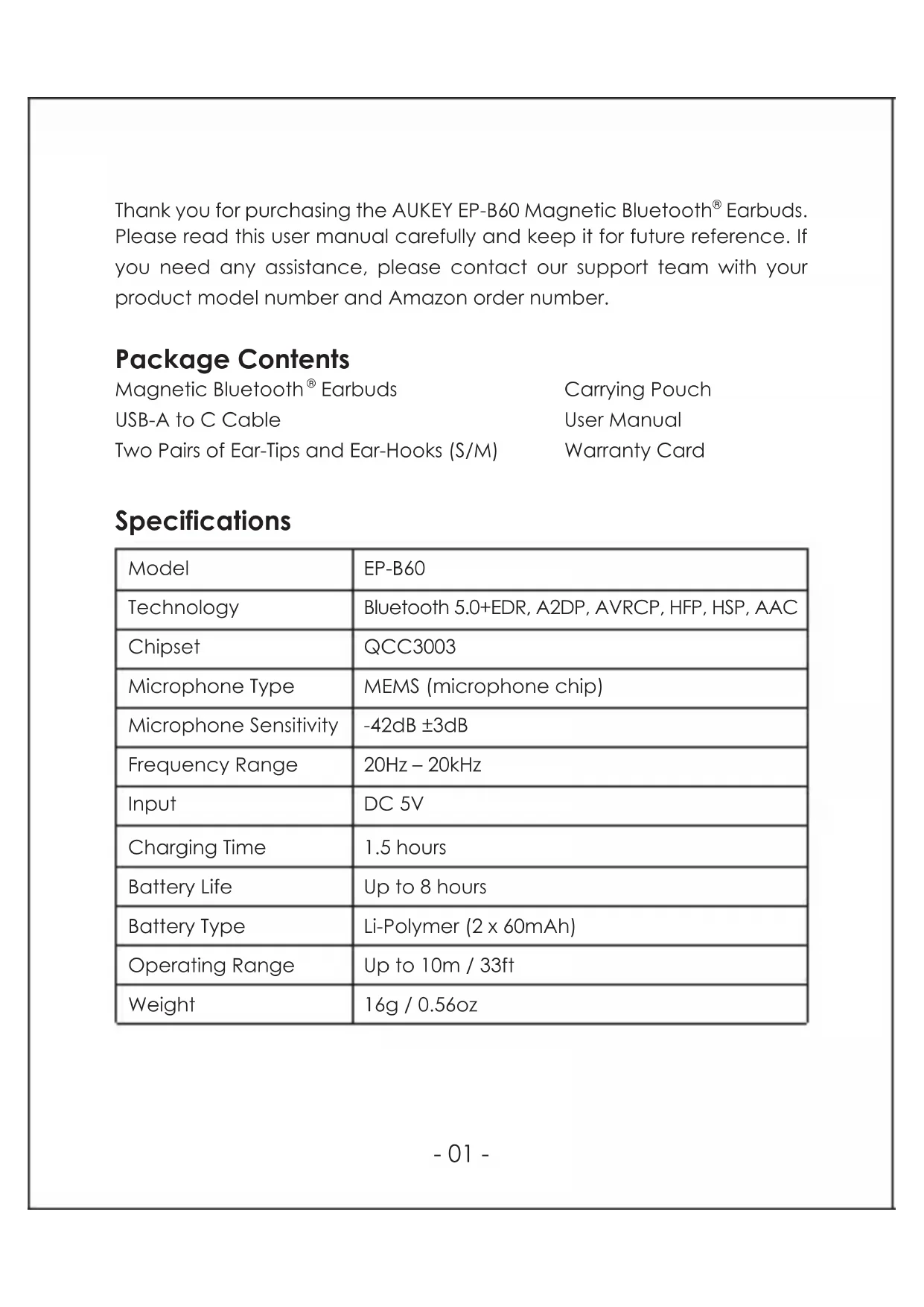 FAQ The earbuds are on but not connecting to my device For the earbuds and your device to establish a connection, you need to put them both in pairing mode. Please follow the instructions in the “Pairing” section of this manual. I’ve established a connection with my smartphone but can’t hear any sound Double-check the volume level on your smartphone and the earbuds. Some smartphones require you to set up the earbuds as an audio output device before the audio can be transmitted. If you’re using a music player or other device, please make sure it supports the A2DP stereo music profile. The sound isn’t very clear or the caller can’t hear my voice clearly Adjust the volume on your smartphone and the earbuds. Try getting closer to your smartphone to rule out the possibility of interference or wireless range-related issues. What is the wireless range of the earbuds? The maximum range is 10m (33ft). However, the actual range will depend on environmental factors. For optimal performance, keep your devices connected with the earbuds within a 15ft–33ft range and make sure that there are no major obstacles (like reinforced steel walls) between the earbuds and your devices. My earbuds won’t turn on Try charging the earbuds for a while. If the earbuds still won’t power on, please contact our support team at the address below. Product Care & Use ● Keep away from liquids and extreme heat ● Don’t use the earbuds at high volume for extended periods, as this may cause permanent hearing damage or loss Warranty & Customer Support For questions, support, or warranty claims, contact us at the address below that corresponds with your region. Please include your Amazon order number and product model number. Amazon US orders: support.us@aukey.com Amazon EU orders: support.eu@aukey.com Amazon CA orders: support.ca@aukey.com Amazon JP orders: support.jp@aukey.com Amazon AU orders: support.au@au key.com *Please note, AUKEY can only provide after sales service for products purchased directly from AUKEY. If you have purchased from a different seller, please contact them directly for service or warranty issues.
