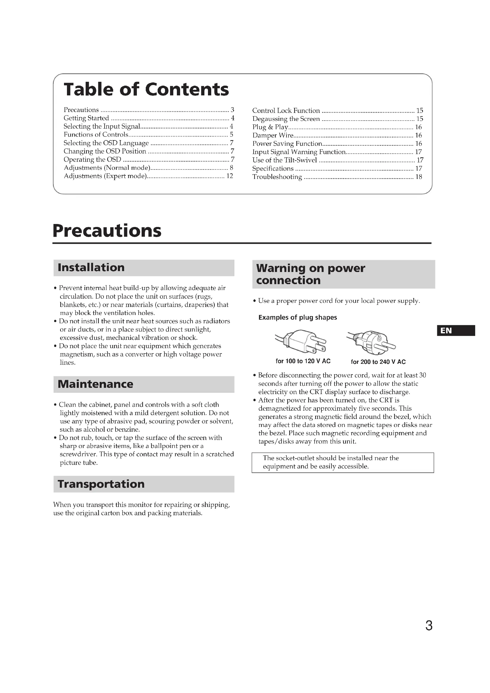 - After the power has been turned on, the CRT is demagnetized for approximately five seconds. This generates a strong magnetic field around the bezel, which may affect the data stored on magnetic tapes or disks near the bezel. Place such magnetic recording equipment and tapes/disks away from this unit. The socket-outlet should be installed near the equipment and be easily accessible. Precautions for 100 to 120 V ACfor 200 to 240 V AC4 Before using this monitor, check that the following items are included in your package: