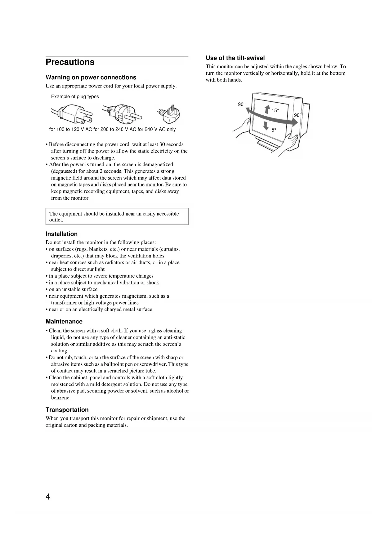 - Clean the cabinet, panel and controls with a soft cloth lightly moistened with a mild detergent solution. Do not use any type of abrasive pad, scouring powder or solvent, such as alcohol or benzene. Transportation When you transport this monitor for repair or shipment, use the original carton and packing materials. Use of the tilt-swivel This monitor can be adjusted within the angles shown below. To turn the monitor vertically or horizontally, hold it at the bottom with both hands. The equipment should be installed near an easily accessible outlet. Example of plug types for 100 to 120 V AC for 200 to 240 V AC for 240 V AC only 90°