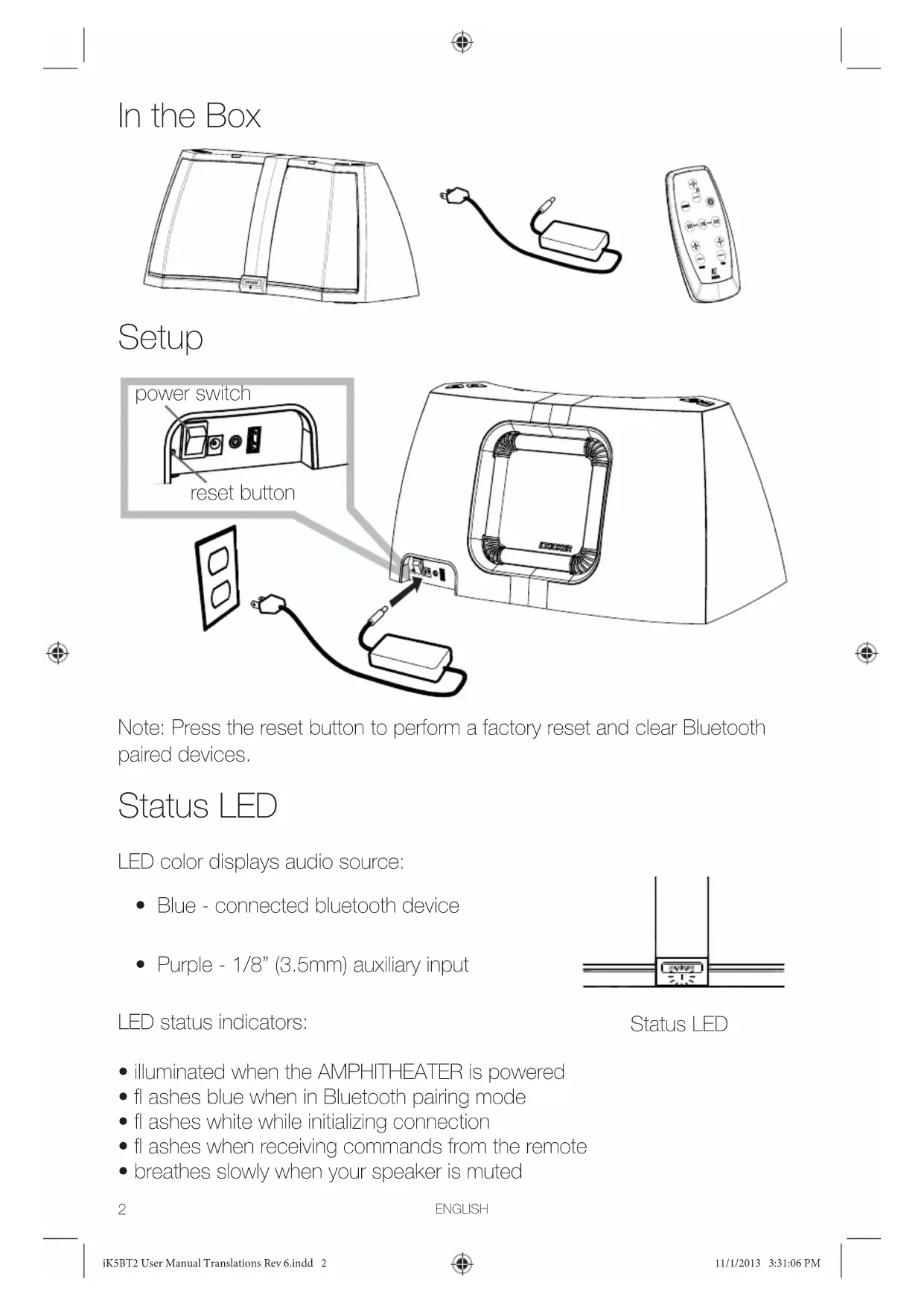 solid blue. iK5BT2 User Manual Translations Rev 6.indd 3iK5BT2 User Manual Translations Rev 6.indd 3 11/1/2013 3:31:06 PM11/1/2013 3:31:06 PM4 ENGLISH Play Auxiliary Devices Touch SOURCE to listen to music from your external device. The aux- input is activated when the status LED is purple. iK5BT2 User Manual Translations Rev 6.indd 4iK5BT2 User Manual Translations Rev 6.indd 4 11/1/2013 3:31:06 PM11/1/2013 3:31:06 PM5 ENGLISH Using the Remote USB Charging Note: The rear USB port acts solely as a power source for charging or powering your USB devices. sourcetrebbassiK5BT2 play / pause mute volume up/down skip backward (hold down to REW) skip forward (hold down to FF) bass up/down treble up/down source select / (hold to pair) iK5BT2 User Manual Translations Rev 6.indd 5iK5BT2 User Manual Translations Rev 6.indd 5 11/1/2013 3:31:07 PM11/1/2013 3:31:07 PM6 ENGLISH Specifi cations