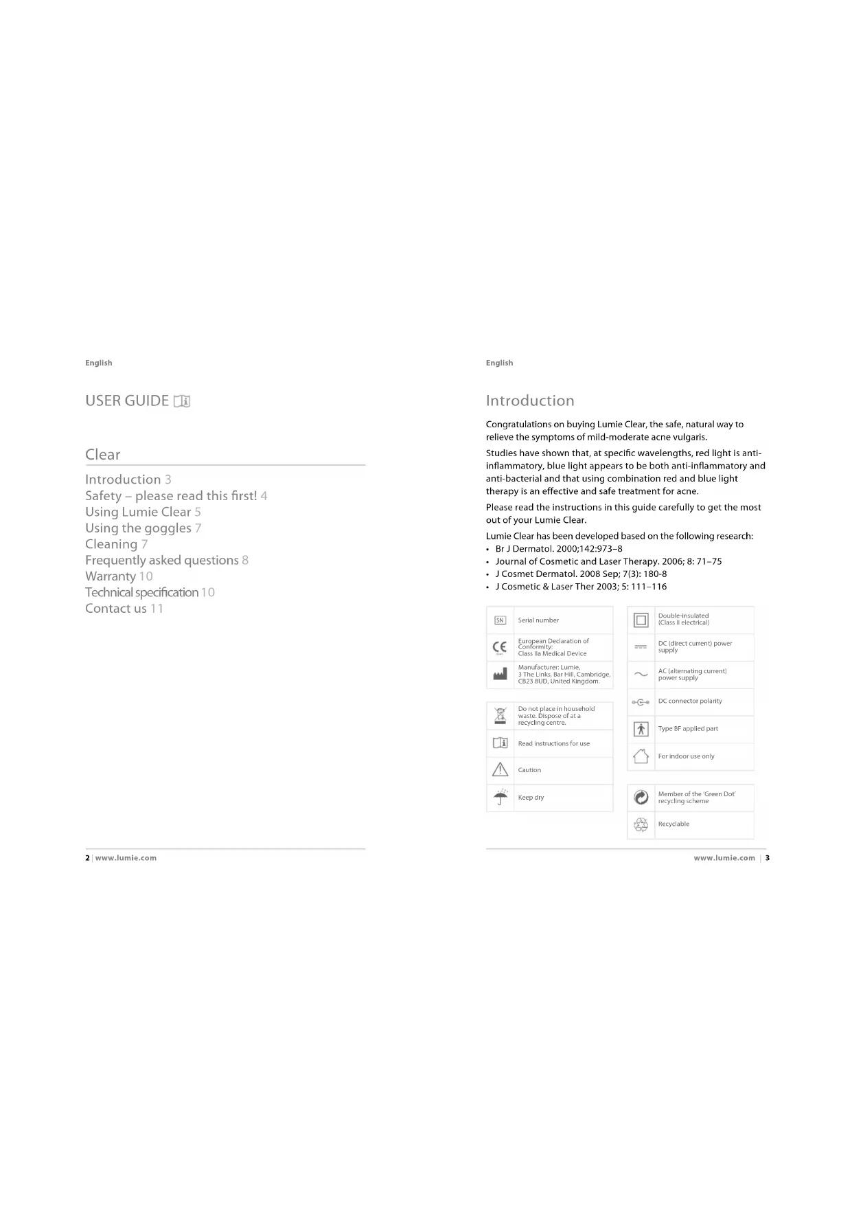 BEDIENUNGSANLEITUNG BRUKSANVISNING GEBRUIKSAANWIJZINGUSER GUIDE Clear Introduction 3 Safety – please read this first! 4 Using Lumie Clear 5 Using the goggles 7 Cleaning 7 Frequently asked questions 8 Warranty 10 Technical specification 10 Contact us 11 2 | www.lumie.com English Introduction Congratulations on buying Lumie Clear, the safe, natural way to relieve the symptoms of mild-moderate acne vulgaris. Studies have shown that, at specific wavelengths, red light is anti- inflammatory, blue light appears to be both anti-inflammatory and anti-bacterial and that using combination red and blue light therapy is an effective and safe treatment for acne. Please read the instructions in this guide carefully to get the most out of your Lumie Clear. Lumie Clear has been developed based on the following research: