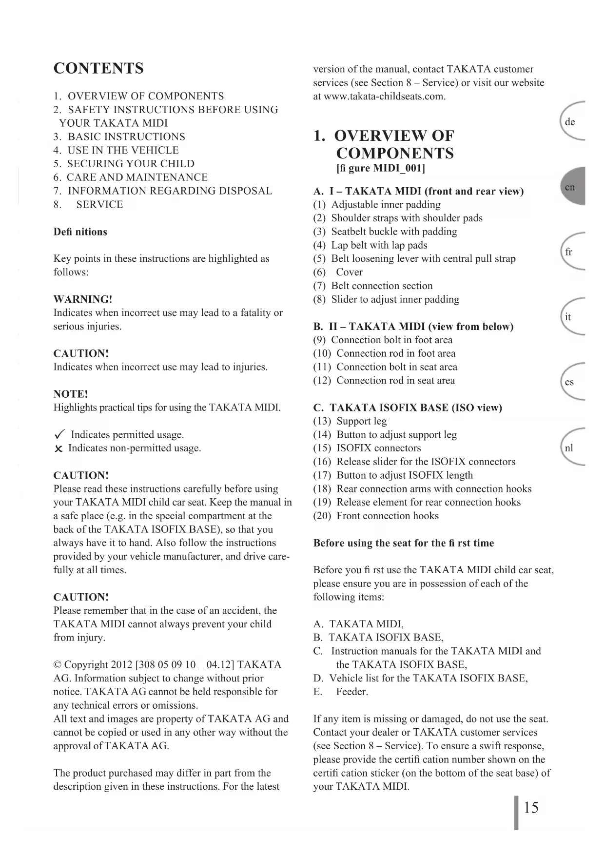 COMPONENTS [fi gure MIDI_001] A. I – TAKATA MIDI (front and rear view) (1) Adjustable inner padding (2) Shoulder straps with shoulder pads (3) Seatbelt buckle with padding (4) Lap belt with lap pads (5) Belt loosening lever with central pull strap (6) Cover (7) Belt connection section (8) Slider to adjust inner padding B. II – TAKATA MIDI (view from below) (9) Connection bolt in foot area (10) Connection rod in foot area (11) Connection bolt in seat area (12) Connection rod in seat area C. TAKATA ISOFIX BASE (ISO view) (13) Support leg (14) Button to adjust support leg (15) ISOFIX connectors (16) Release slider for the ISOFIX connectors (17) Button to adjust ISOFIX length (18) Rear connection arms with connection hooks (19) Release element for rear connection hooks (20) Front connection hooks Before using the seat for the fi rst time Before you fi rst use the TAKATA MIDI child car seat, please ensure you are in possession of each of the following items: A. TAKATA MIDI, B. TAKATA ISOFIX BASE, C. Instruction manuals for the TAKATA MIDI and the TAKATA ISOFIX BASE, D. Vehicle list for the TAKATA ISOFIX BASE, E. Feeder. If any item is missing or damaged, do not use the seat. Contact your dealer or TAKATA customer services (see Section 8 – Service). To ensure a swift response, please provide the certifi cation number shown on the certifi cation sticker (on the bottom of the seat base) of your TAKATA MIDI.