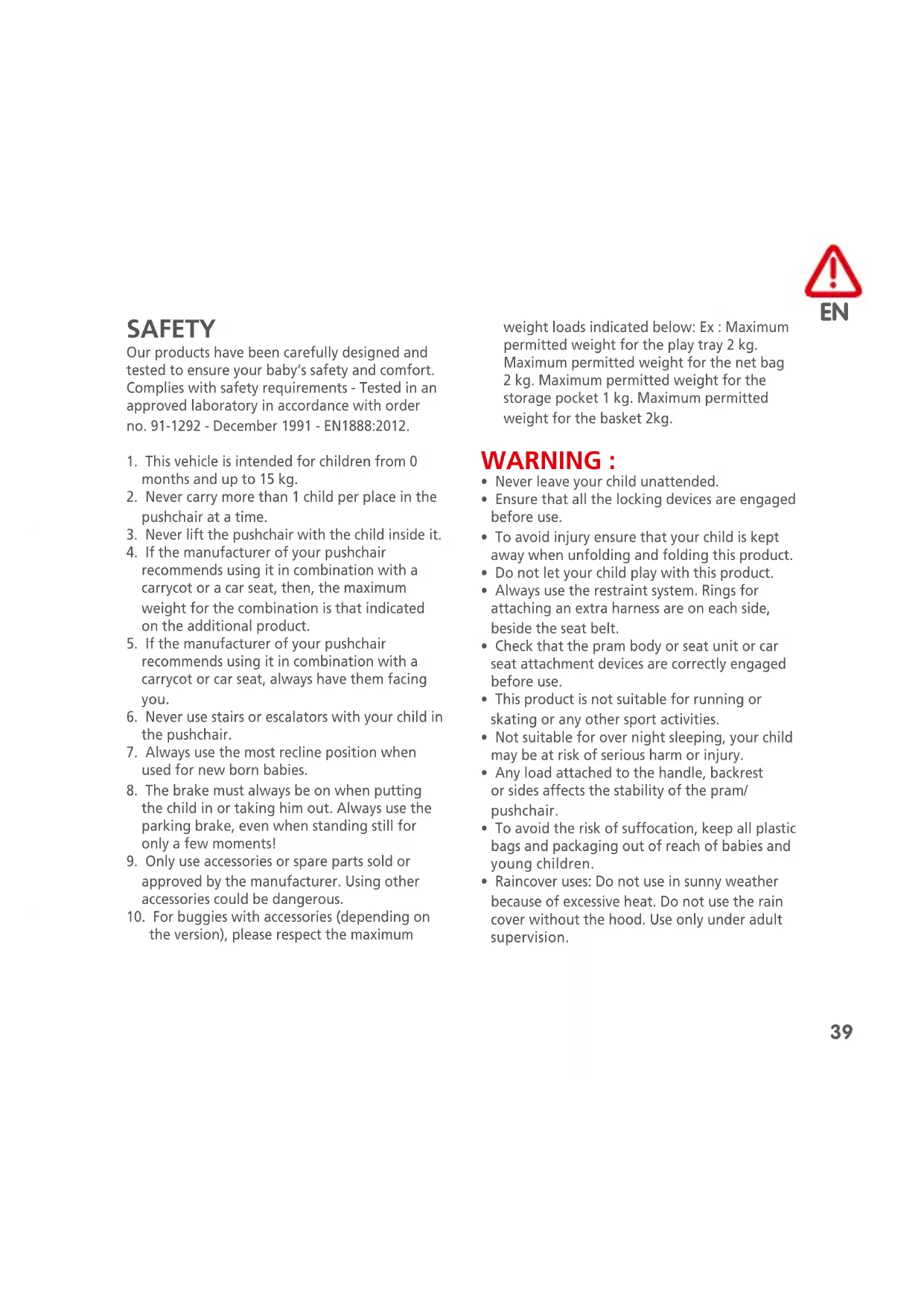 SAFETY Our products have been carefully designed and tested to ensure your baby’s safety and comfort. Complies with safety requirements - Tested in an approved laboratory in accordance with order no. 91-1292 - December 1991 - EN1888:2012.
