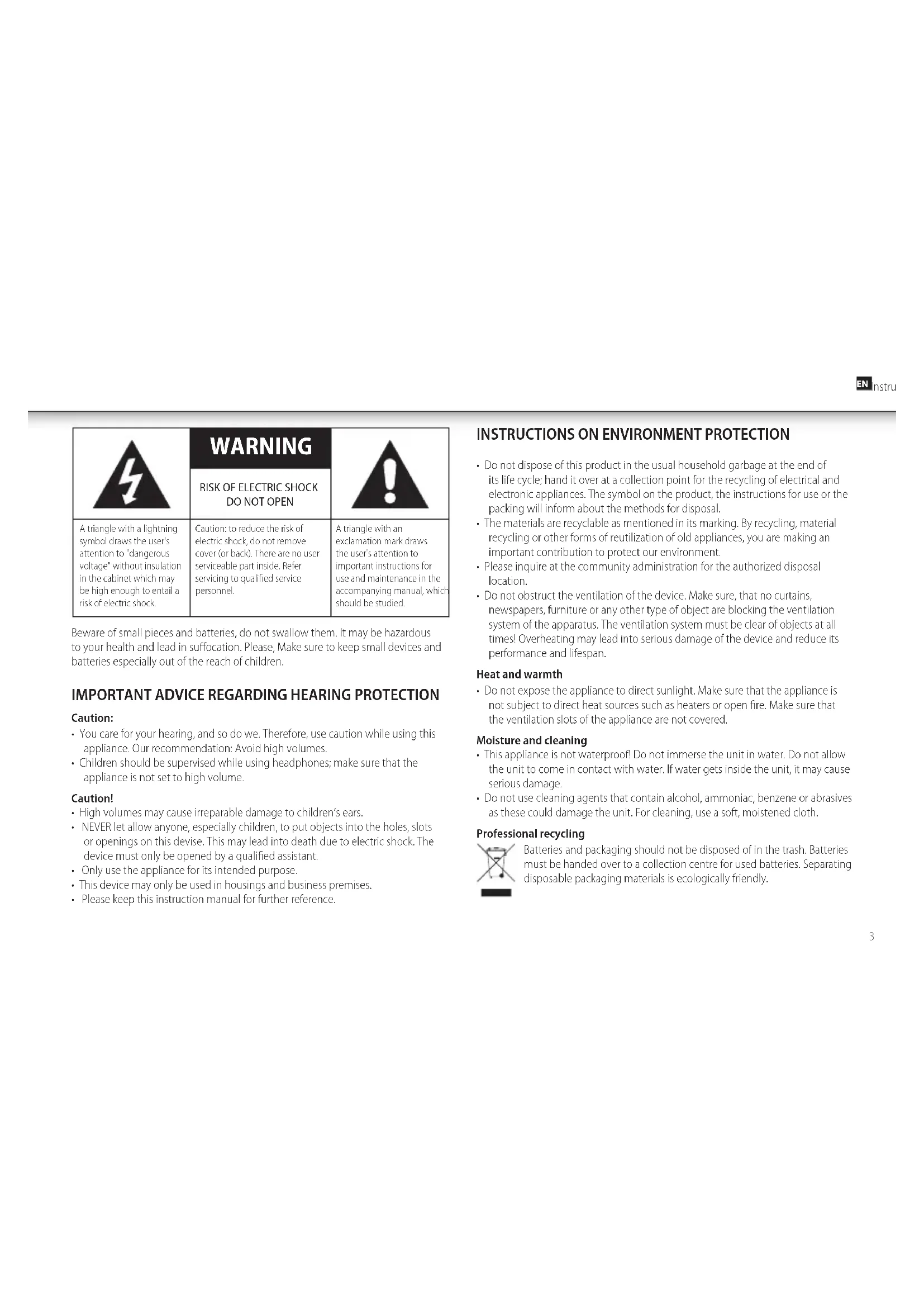 A triangle with a lightning symbol draws the user's attention to "dangerous voltage" without insulation in the cabinet which may be high enough to entail a risk of electric shock. Caution: to reduce the risk of electric shock, do not remove cover (or back). There are no user serviceable part inside. Refer servicing to qualified service personnel. A triangle with an exclamation mark draws the user's attention to important instructions for use and maintenance in the accompanying manual, which should be studied. Beware of small pieces and batteries, do not swallow them. It may be hazardous to your health and lead in suffocation. Please, Make sure to keep small devices and batteries especially out of the reach of children.
