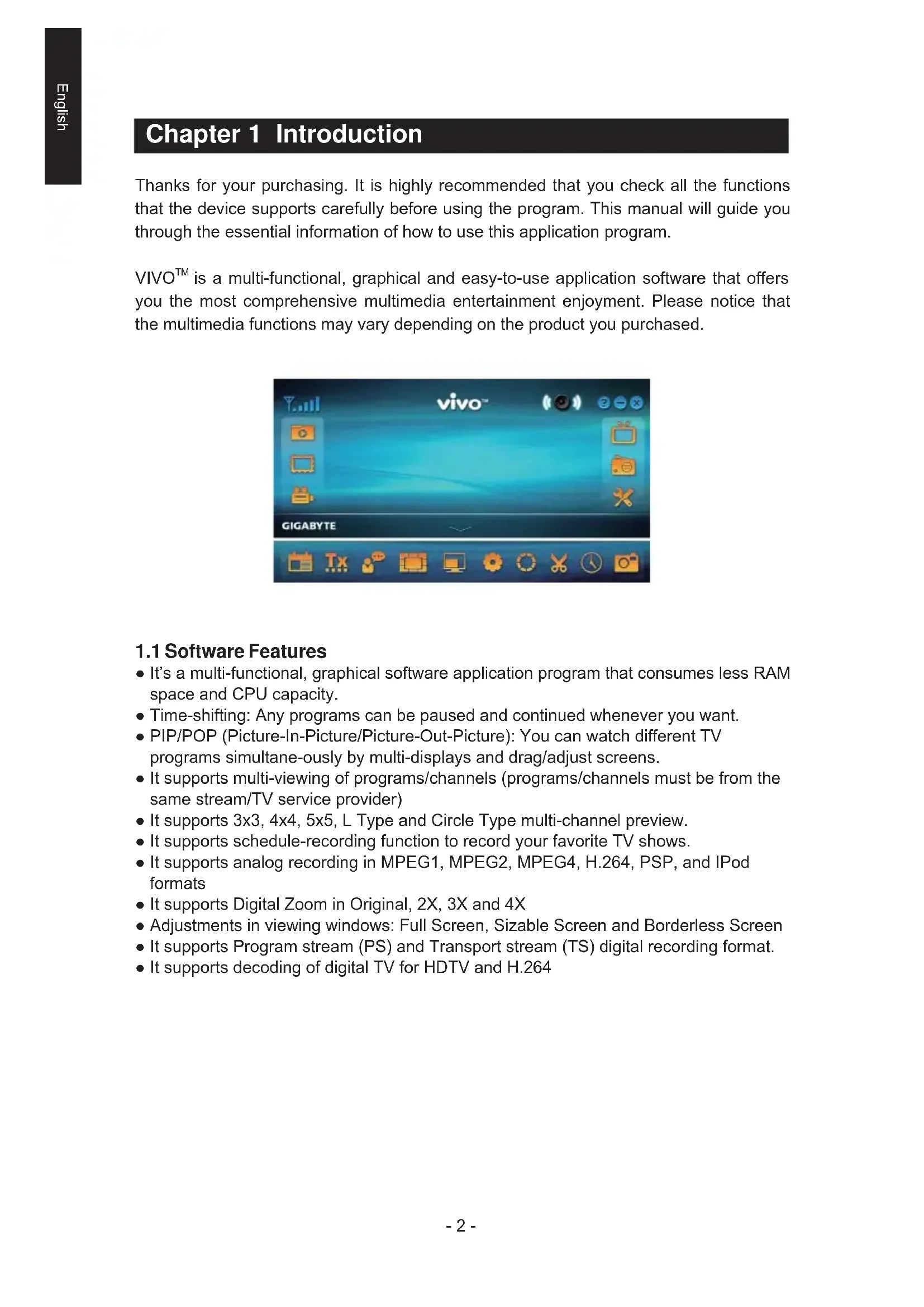 ● It’s a multi-functional, graphical software application program that consumes less RAM space and CPU capacity. ● Time-shifting: Any programs can be paused and continued whenever you want. ● PIP/POP (Picture-In-Picture/Picture-Out-Picture): You can watch different TV programs simultane-ously by multi-displays and drag/adjust screens. ● It supports multi-viewing of programs/channels (programs/channels must be from the same stream/TV service provider) ● It supports 3x3, 4x4, 5x5, L Type and Circle Type multi-channel preview. ● It supports schedule-recording function to record your favorite TV shows. ● It supports analog recording in MPEG1, MPEG2, MPEG4, H.264, PSP, and IPod formats ● It supports Digital Zoom in Original, 2X, 3X and 4X ● Adjustments in viewing windows: Full Screen, Sizable Screen and Borderless Screen ● It supports Program stream (PS) and Transport stream (TS) digital recording format. ● It supports decoding of digital TV for HDTV and H.264English