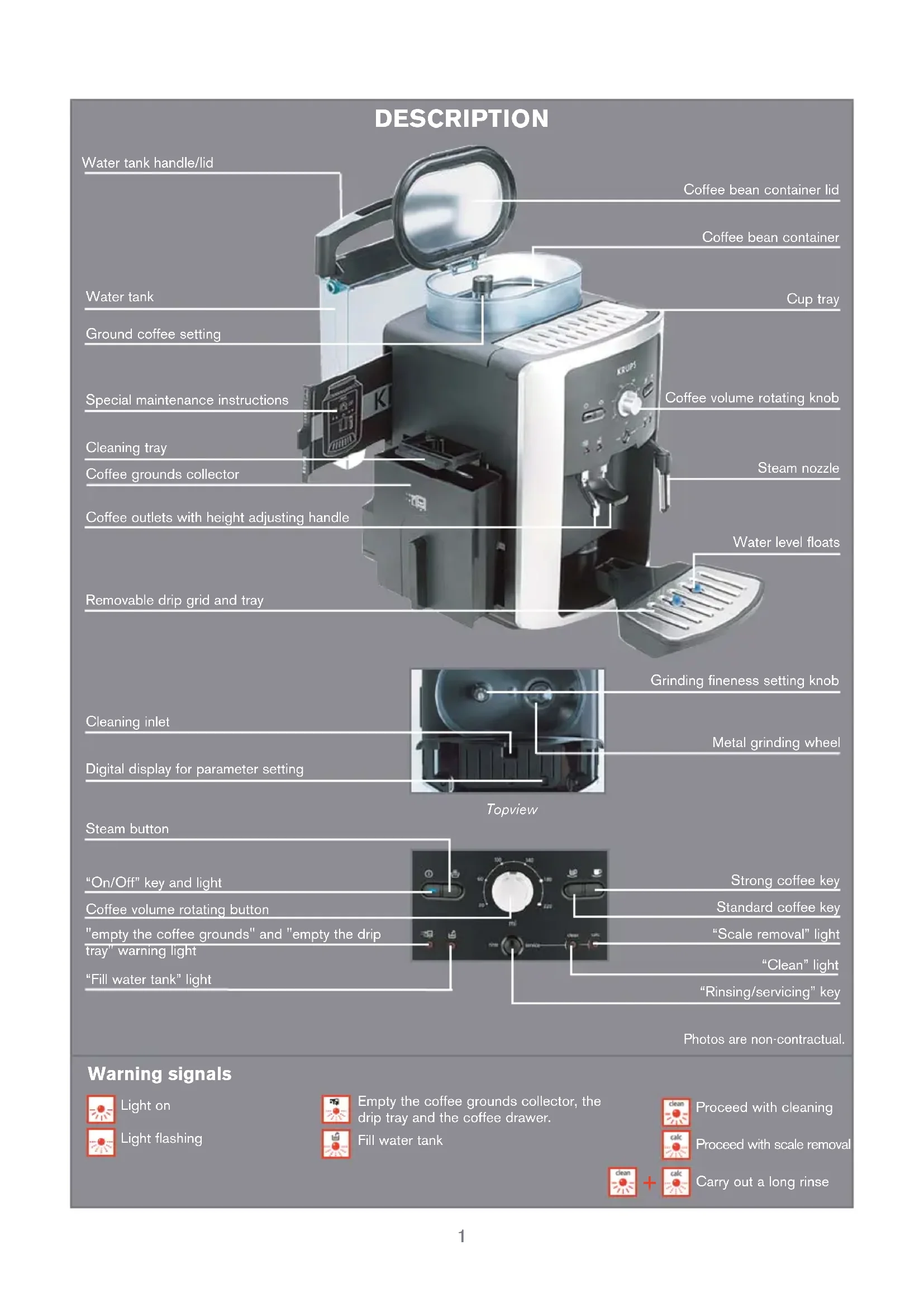 RECIPES ...14 CONTENTS Photos are non-contractual. F 088 Claris –Aqua Filter System Cartridge (not supplied) XS 3000 Packet of 10 cleaning tablets (two tablets sup- plied) F 054 Descaling powder (one sachet sup- plied) XS6000 Auto- Cappuccino Set (not supplied) XS 4000 KRUPS Cleaning fluid for Cappuccino sys- tem (not supplied) accessories (sold separately) ENGLISH1 Coffee volume rotating button Steam button “On/Off” key and light Standard coffee key Strong coffee key “Clean” light “Scale removal” light “Fill water tank” light "empty the coffee grounds" and "empty the drip tray" warning light “Rinsing/servicing” key Removable drip grid and tray Coffee outlets with height adjusting handle Coffee grounds collector Coffee volume rotating knob Coffee bean container Steam nozzle Coffee bean container lid Water tank handle/lid Water tank Cup tray Water level floats Topview Grinding fineness setting knob Cleaning inlet DESCRIPTION Ground coffee setting Cleaning tray Empty the coffee grounds collector, the drip tray and the coffee drawer. Fill water tank Warning signals Proceed with cleaning Proceed with scale removal Light on Light flashing Metal grinding wheel Digital display for parameter setting Special maintenance instructions Photos are non-contractual.