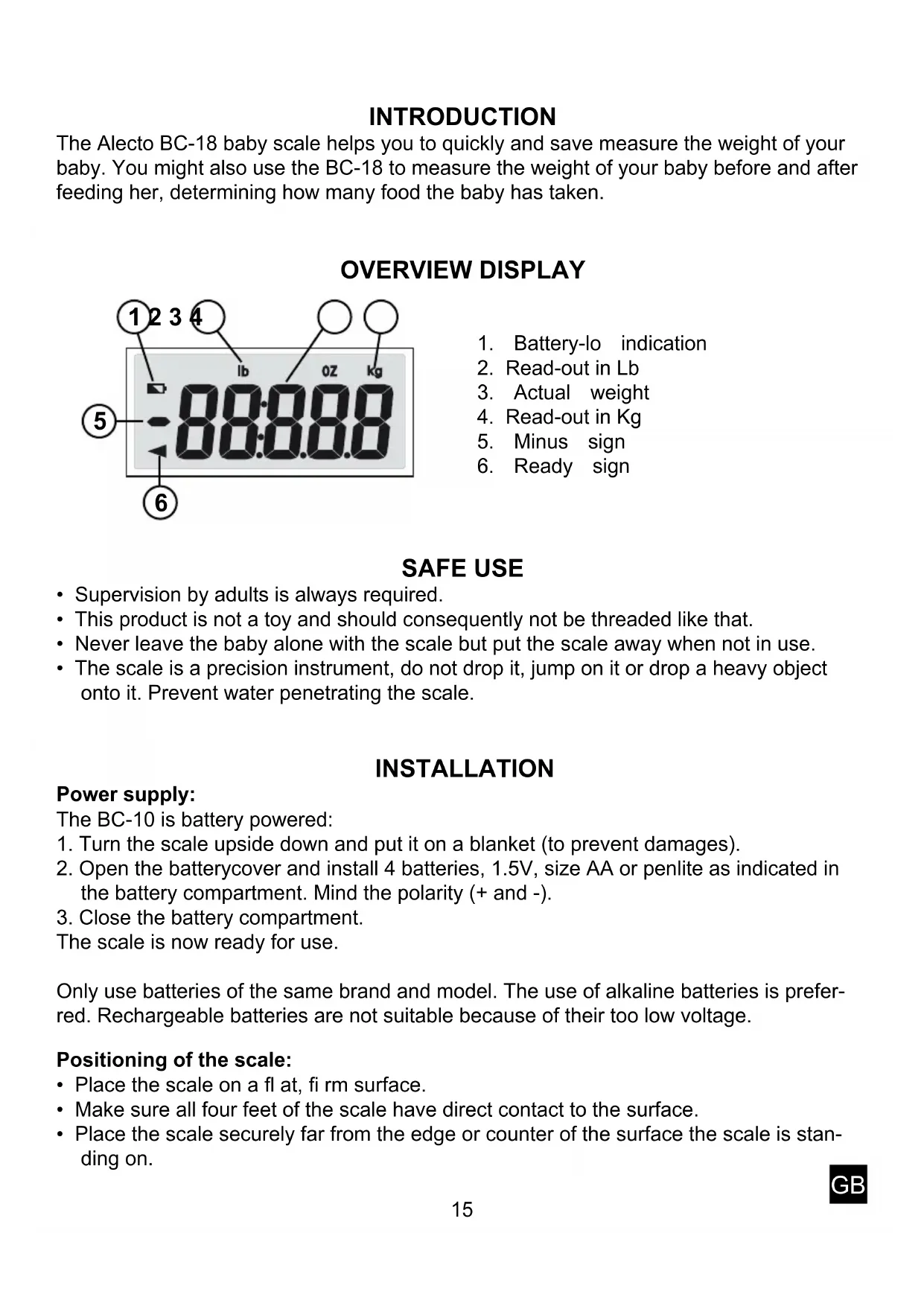 - In case of a possible malfunction, we suggest to rst replace the batteries. In case this does not help, please consult the Alecto service department on telephone number +31(0)73-6411355. GB18 SPECIFICATIONS Power supply: ....................................... 4x 1,5Volt, size AA or penlite Maximum load: ..................................... 20 Kg Minimum readout: ................................. 50 gram Resolution:............................................10 gram Tollerance: ............................................ 5% Readout: ............................................... Kg/Lb Work temperature: ................................ 5ºC ~ 30ºC Storage temperature:............................10ºC ~ 60ºC The BC-18 is not suitable for trade aims.