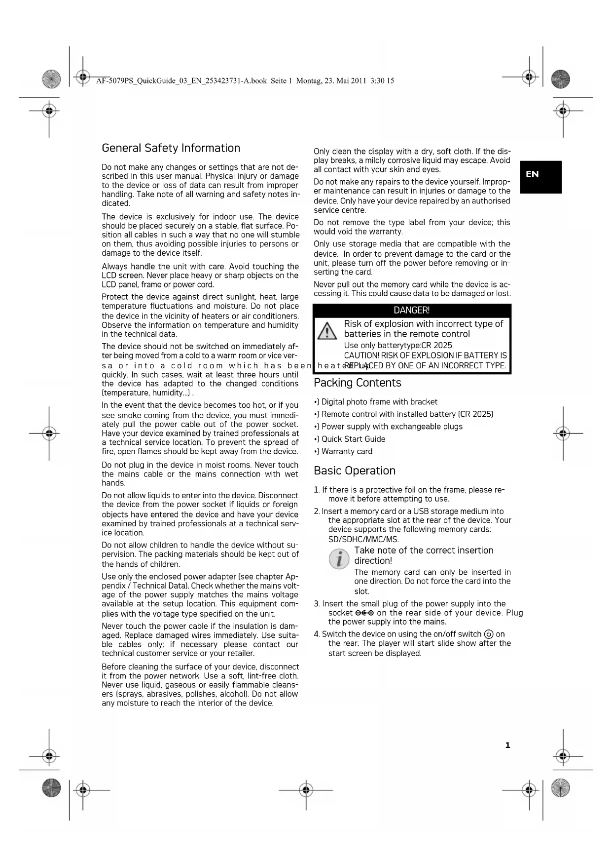 the rear. The player will start slide show after the start screen be displayed. DANGER! Risk of explosion with incorrect type of batteries in the remote control Use only batterytype:CR 2025. CAUTION! RISK OF EXPLOSION IF BATTERY IS REPLACED BY ONE OF AN INCORRECT TYPE. Take note of the correct insertion direction! The memory card can only be inserted in one direction. Do not force the card into the slot. AF-5079PS_QuickGuide_03_EN_253423731-A.book Seite 1 Montag, 23. Mai 2011 3:30 152