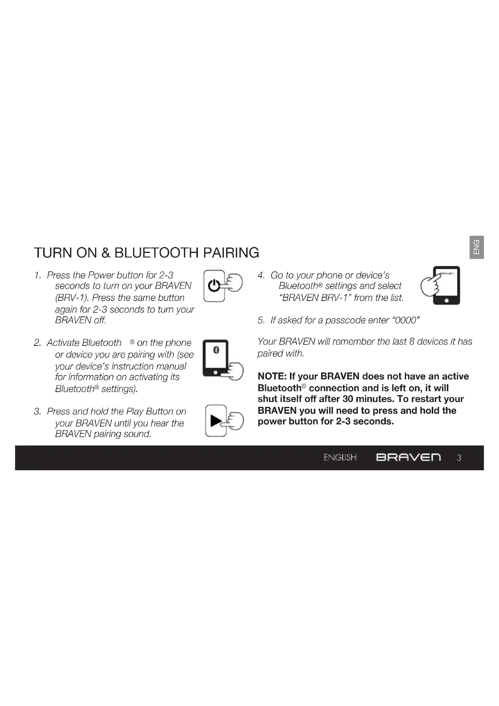 seconds to turn on your BRAVEN (BRV-1). Press the same button again for 2-3 seconds to turn your BRAVEN off.