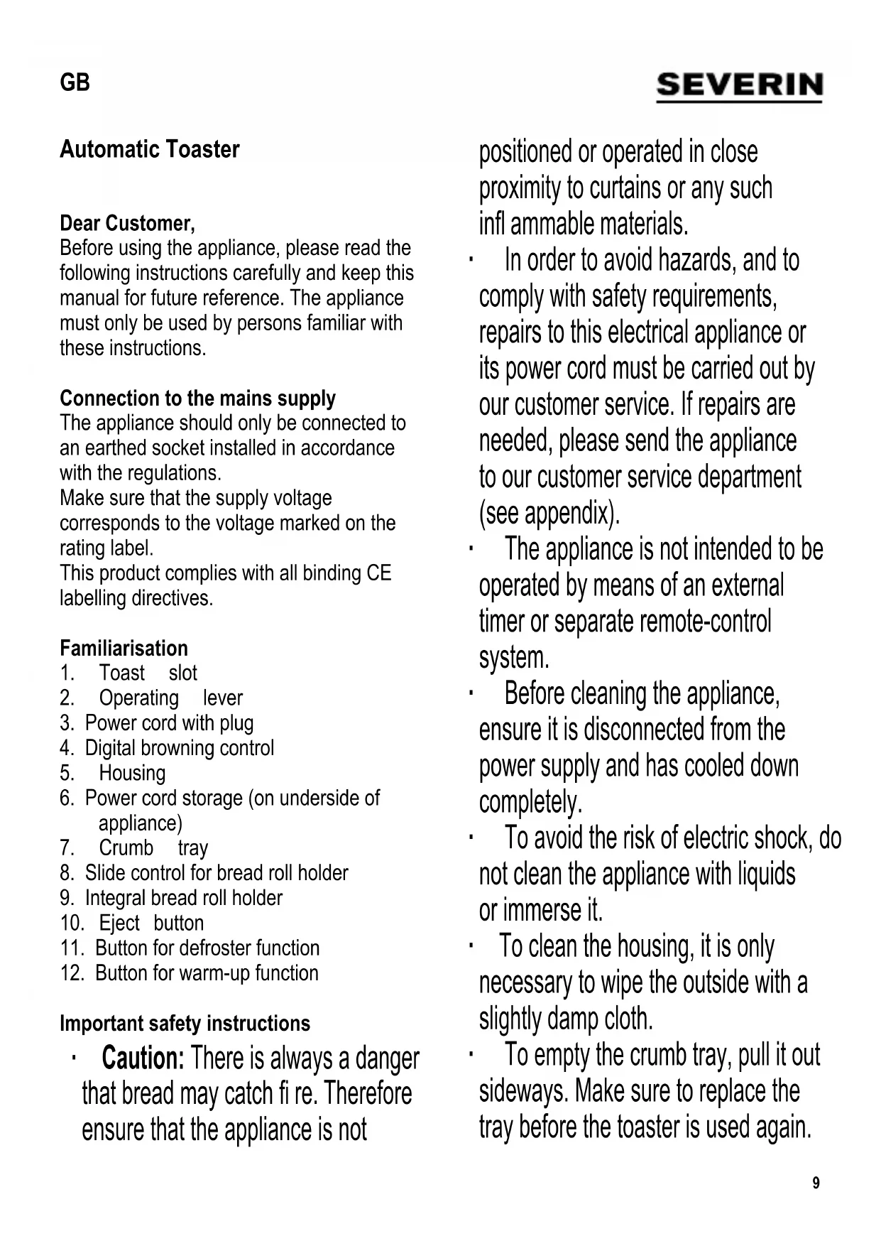Important safety instructions ∙ Caution: There is always a danger that bread may catch fi re. Therefore ensure that the appliance is not positioned or operated in close proximity to curtains or any such infl ammable materials. ∙ In order to avoid hazards, and to comply with safety requirements, repairs to this electrical appliance or its power cord must be carried out by our customer service. If repairs are needed, please send the appliance to our customer service department (see appendix). ∙ The appliance is not intended to be operated by means of an external timer or separate remote-control system. ∙ Before cleaning the appliance, ensure it is disconnected from the power supply and has cooled down completely. ∙ To avoid the risk of electric shock, do not clean the appliance with liquids or immerse it. ∙ To clean the housing, it is only necessary to wipe the outside with a slightly damp cloth. ∙ To empty the crumb tray, pull it out sideways. Make sure to replace the tray before the toaster is used again. GB10 ∙ This appliance is intended for domestic or similar applications, such as the - staff kitchens in shops, offi ces and other similar working environments, - agricultural working environments, - by customers in hotels, motels etc. and similar accommodation, - in bed-and breakfast type environments. ∙ This appliance may be used by children (at least 8 years of age) and by persons with reduced physical, sensory or mental capabilities, or lacking experience and knowledge, provided they have been given supervision or instruction concerning the use of the appliance and fully understand all dangers and safety precautions involved. ∙ Children must not be permitted to play with the appliance. ∙ Children must not be permitted to carry out any cleaning or maintenance work on the appliance unless they are supervised and at least 8 years of age. ∙ The appliance and its power cord must be kept well away from children under 8 at all times. ∙ Caution: Keep any packaging materials well away from children – these are a potential source of danger, e.g. of suffocation. ∙ Always position the appliance on a level heat-resistant surface. ∙ In order to prevent damage to the housing, do not position the appliance on or near hot surfaces or open fl ames such as hot-plates or gas fl ames. ∙ Caution: the accessible housing surfaces become very hot during operation. Burns can occur from touching the hot parts. ∙ Every time the appliance is used, the main body including the power cord as well as any attachment fi tted should be checked thoroughly for any defects. Should the appliance, for instance, have been dropped onto a hard surface, or if excessive force has been used to pull the power cord, it must no longer be used: even invisible damage may have adverse effects on the operational safety of the appliance. ∙ Do not allow the power cord to touch hot surfaces. ∙ Do not let the power cord hang free. ∙ Do not leave the appliance unattended while in use. ∙ Do not cover the toast slot during operation. ∙ Do not try to remove bread from the toaster with your fi ngers or insert any other objects (e.g. knives, forks) into the toast slot as the heating elements carry a live current. ∙ Always remove the plug from the wall socket11 - after use, - in case of any malfunction, - before cleaning the appliance. ∙ When removing the plug from the wall socket, never pull on the power cord; always grip the plug itself. ∙ No responsibility will be accepted if damage results from improper use, or if these instructions are not complied with. Operation General information ∙ Caution: The operating lever locks down only when the plug is inserted. ∙ Do not use slices which are too thick or too big, as they may become stuck in the toaster. The thickness of the slices to be toasted should not exceed 14 mm. ∙ In case of problems or malfunctions during use, and before cleaning, always remove the plug from the wall socket. ∙ To remove a slice caught in the slot, use a blunt wooden implement (e.g. a brush handle). Never touch the metal heating elements. Before using for the fi rst time ∙ Clean the toaster thoroughly (see Cleaning and care). ∙ Switch on the toaster and go through at least fi ve cycles, at the maximum browning setting, without any bread inserted. ∙ Allow the toaster to cool down between cycles. ∙ When switching on the appliance for the fi rst time, the toaster may emit a slight smell and a little smoke, which will disappear after a short while. For that reason, adequate ventilation should be ensured by opening windows or balcony doors. Automatic switch-off This appliance comes with an automatic switch-off feature. If a bread slice should become stuck and cannot be ejected after the toasting cycle is complete, the toaster will automatically switch off. Should this occur, disconnect the appliance from the mains and remove the bread slice as described in the section General information. Adjusting the degree of browning The desired degree of browning may be set using the digital browning control, once the operating lever has been pushed down. Light: levels 1-3 Dark: levels 5-7 In the case of sliced bread specifi cally intended for toasting, we recommend setting the browning control to position 4. The browning level last selected remains stored for the next toasting cycle. Operation ∙ Insert the plug into the wall socket. ∙ Insert the bread into the toast slot and press the operating lever down. ∙ The indicator lights on the operating lever and the three function buttons will initially fl ash, and are then replaced by steady lights on the eject button ( ) and the selected browning setting. ∙ If required, the browning level can be adjusted by using the +/- buttons. ∙ Once the desired degree of browning is reached, the toaster switches off12 automatically and the slices are ejected. The indicator light goes out. ∙ To achieve regular browning when toasti