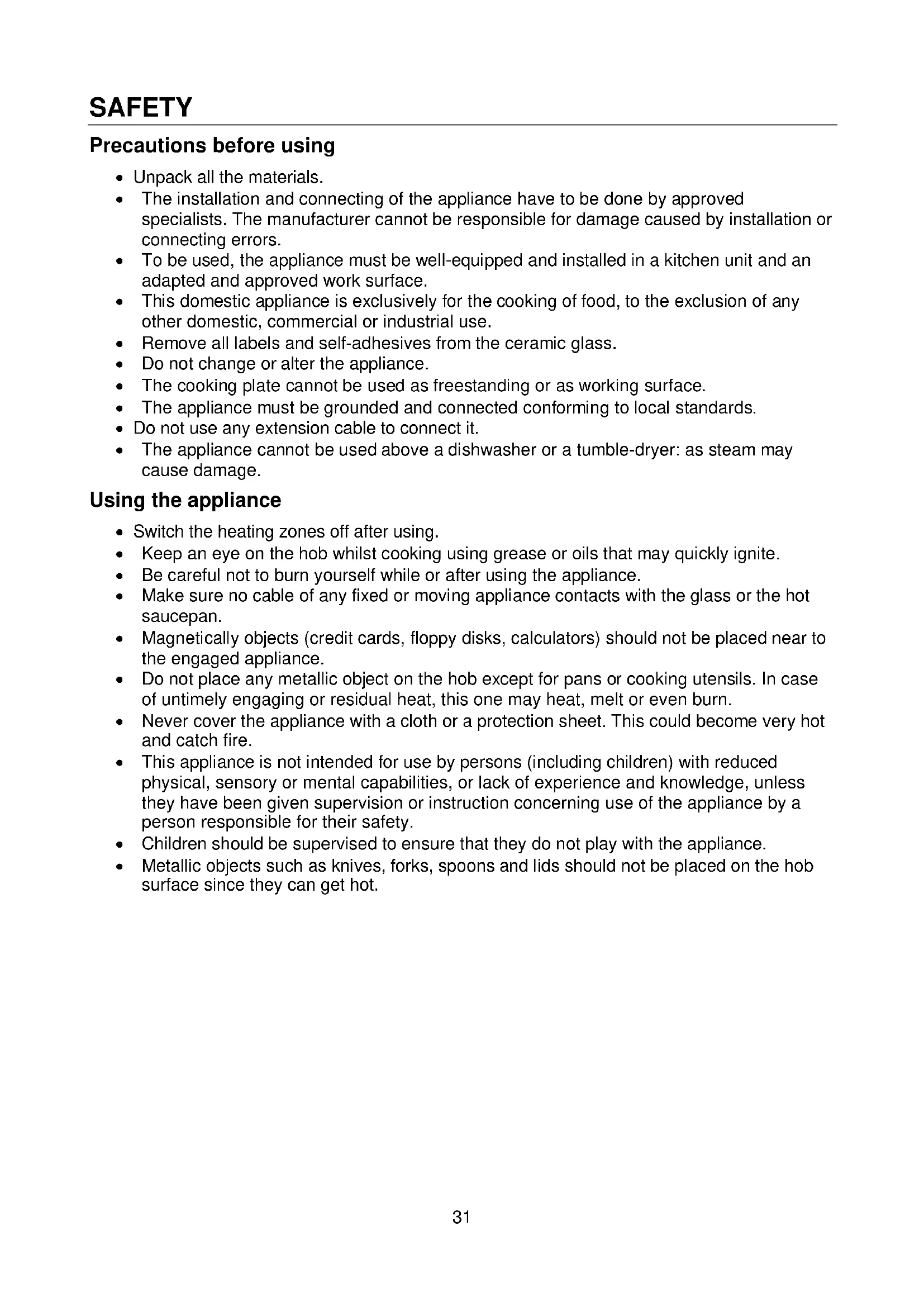 - ELECTRICAL CONNECTION SAFETY Precautions before using Unpack all the materials. The installation and connecting of the appliance have to be done by approved specialists. The manufacturer cannot be responsible for damage caused by installation or connecting errors. To be used, the appliance must be well-equipped and installed in a kitchen unit and an adapted and approved work surface. This domestic appliance is exclusively for the cooking of food, to the exclusion of any other domestic, commercial or industrial use. Remove all labels and self-adhesives from the ceramic glass. Do not change or alter the appliance. The cooking plate cannot be used as freestanding or as working surface. The appliance must be grounded and connected conforming to local standards. Do not use any extension cable to connect it. The appliance cannot be used above a dishwasher or a tumble-dryer: as steam may cause damage. Using the appliance Switch the heating zones off after using. Keep an eye on the hob whilst cooking using grease or oils that may quickly ignite. Be careful not to burn yourself while or after using the appliance. Make sure no cable of any fixed or moving appliance contacts with the glass or the hot saucepan. Magnetically objects (credit cards, floppy disks, calculators) should not be placed near to the engaged appliance. Do not place any metallic object on the hob except for pans or cooking utensils. In case of untimely engaging or residual heat, this one may heat, melt or even burn. Never cover the appliance with a cloth or a protection sheet. This could become very hot and catch fire. This appliance is not intended for use by persons (including children) with reduced physical, sensory or mental capabilities, or lack of experience and knowledge, unless they have been given supervision or instruction concerning use of the appliance by a person responsible for their safety. Children should be supervised to ensure that they do not play with the appliance. Metallic objects such as knives, forks, spoons and lids should not be placed on the hob surface since they can get hot.32 Precautions not to damage the appliance Raw pan bottoms or damaged saucepans (not enamelled cast iron pots,) may damage the ceramic glass. Sand or other abrasive materials may damage ceramic glass. Avoid dropping objects, even little ones, on the vitroceramic. Do not hit the edges of the glass with saucepans. Make sure that the ventilation of the appliance works according to the manufacturer’s instructions. Do not put or leave empty saucepans on the vitroceramic hobs. Sugar, synthetic materials or aluminium sheets must not contact with the heating zones. These may cause breaks or other alterations of the vitroceramic glass by cooling: switch on the appliance and take them immediately out of the hot heating zone (be careful: do not burn yourself). Never place any hot container over the control panel. If a drawer is situated under the embedded appliance, make sure the space between the content of the drawer and the underside of the appliance is large enough (2cm). This is essential to guarantee correct ventilation. Never put any inflammable object (ex. sprays) into the drawer situated under the vitroceramic hob. All cutlery drawers must be resistant to heat. Precautions in case of appliance failure If a defect is noticed, switch off the appliance and turn off at the main electrical supply. If the ceramic glass is cracked or fissured, you must unplug the appliance and contact the after sales service. Repairing has to be done by specialists. Do not open the appliance by yourself. p. 3731
