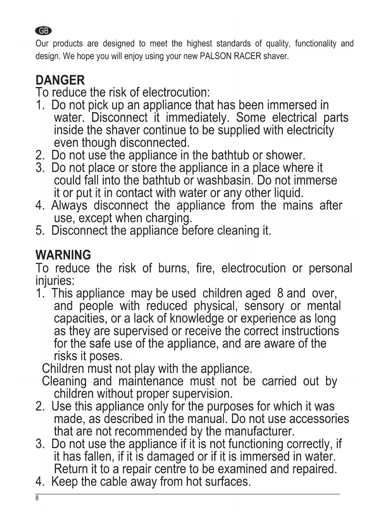 Our products are designed to meet the highest standards of quality, functionality and design.WehopeyouwillenjoyusingyournewPALSONRACERshaver. DaNgEr To reduce the risk of electrocution: