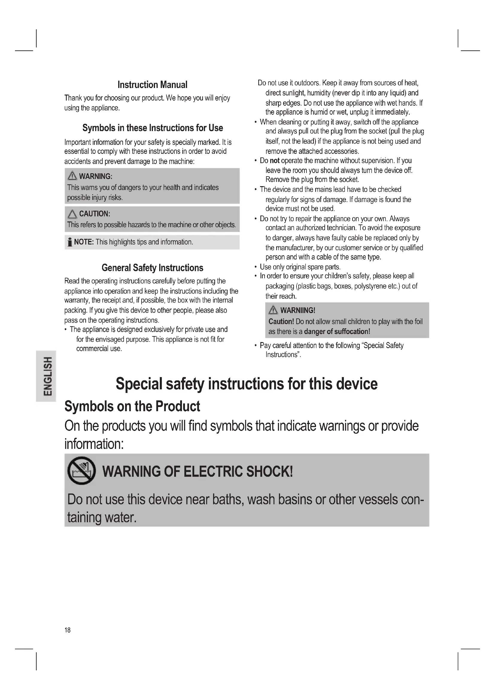 - The appliance is designed exclusively for private use and for the envisaged purpose. This appliance is not t for commercial use. Special safety instructions for this device Symbols on the Product On the products you will nd symbols that indicate warnings or provide information: WARNING OF ELECTRIC SHOCK! Do not use this device near baths, wash basins or other vessels con- taining water.19 WARNUNG: