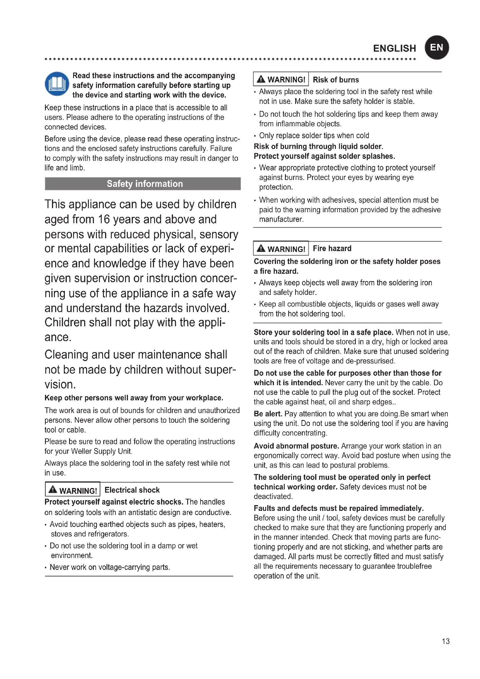vision. Keep other persons well away from your workplace. The work area is out of bounds for children and unauthorized persons. Never allow other persons to touch the soldering tool or cable. Please be sure to read and follow the operating instructions for your Weller Supply Unit. Always place the soldering tool in the safety rest while not in use. WARNING! Electrical shock Protect yourself against electric shocks. The handles on soldering tools with an antistatic design are conductive.
