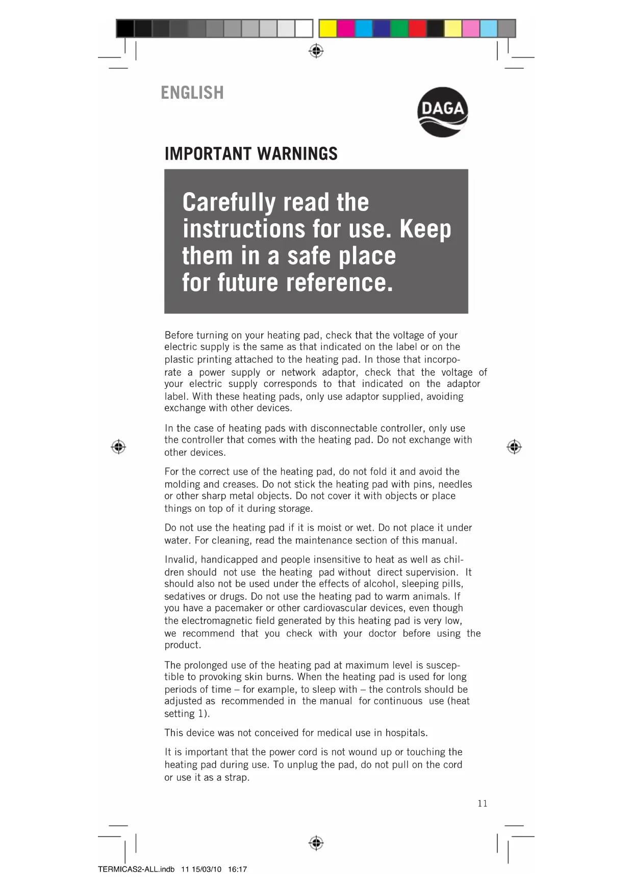 The electric heating pads provide soft flexible heat letting the user take advantage of its two basic and complementary properties. First, flexible heat mitigates the effects of the cold and humidity, of- fering personal comfort. Also, heat is very efficient in therapeutic pain treatments to alleviate muscular and articular discomfort. However, we recommend that you do not apply the heating pad to areas of the body that are swollen, injured or bloated without first consulting your doctor. The plastic models and the L and L2 models have an extra plastic cover to make the application of lotions and special ointments easier and help heat penetration to local areas. The cloth models give smooth heat that transpires and their fluffy and soft cloth give a sensation of comfort. Flexible heat is a dry heat that creates a calming effect, stimulates the circulation and reduces muscles tension. For these reasons, it is recommended in pain treatments such as arthrosis, arthritis and rheumatism, among others, in the soft parts of the body. For specific localized treatments, we recommend the use of ergo- nomic heating pads designed especially to adapt to specific body parts. For more information, consult the attached Daga catalogue. Values of Daga Quality The Daga Flexy Heat technology guarantees that the product you have acquired has been designed, manufactured and verified using the latest technology and in compliance with the highest quality stan- dards. The heating pads are manufactured using only carefully chosen and tested material and components to offer the ideal direct-application, long-life and defect-free product. The precision of the electronic control circuit ensures intelligent heat regulation while it supervises correct product operation, preventing any risk of failure or wrongful use. Thanks to the special design, all the products made with Daga Flexy Heat technology generate a very low electromagnetic field (EMF). This way, the user is not exposed to radiation while using the product. TERMICAS2-ALL.indb 17 15/03/10 16:17ENGLISH