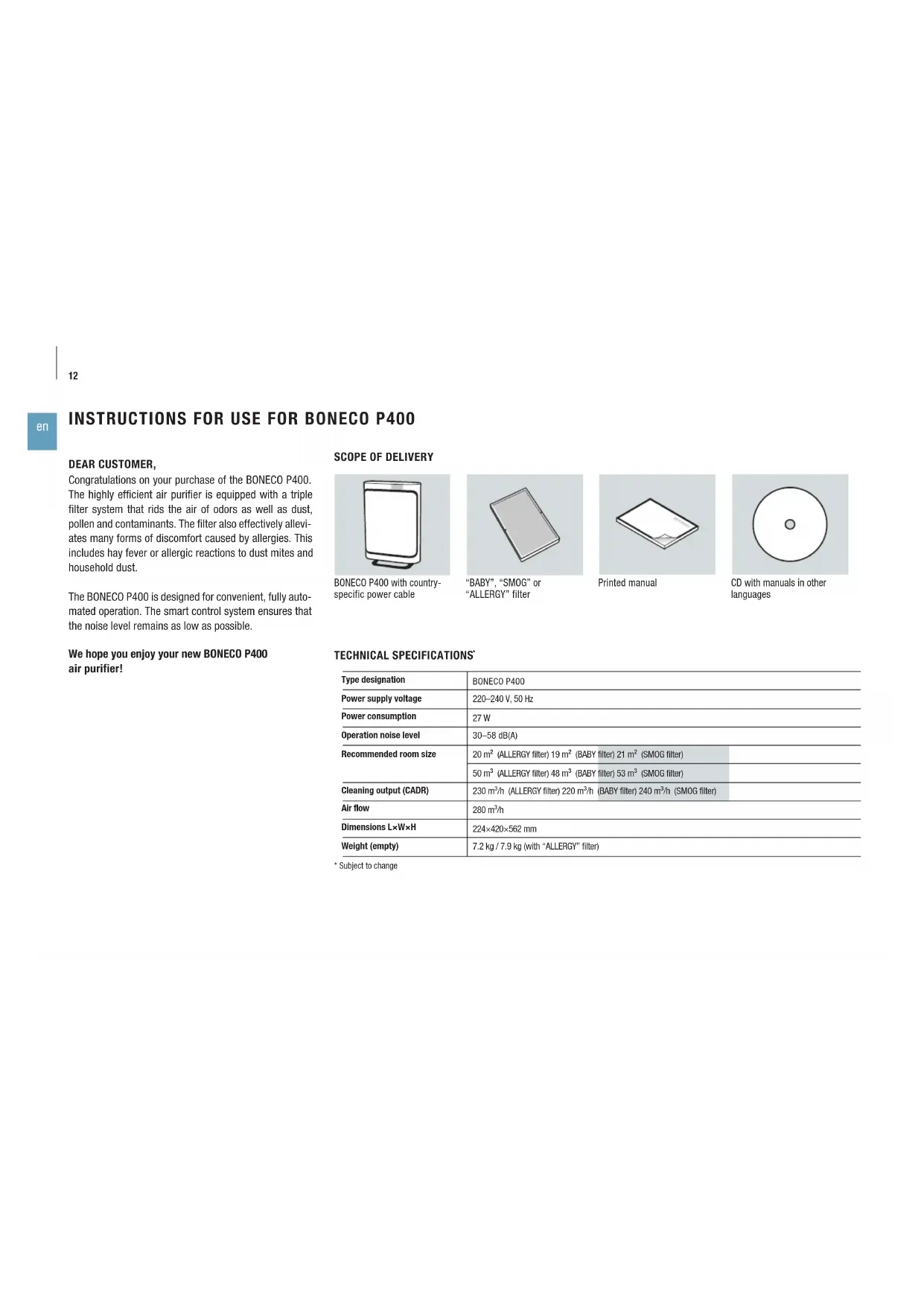 DEAR CUSTOMER, Congratulations on your purchase of the BONECO P400. The highly efficient air purifier is equipped with a triple filter system that rids the air of odors as well as dust, pollen and contaminants. The filter also effectively allevi- ates many forms of discomfort caused by allergies. This includes hay fever or allergic reactions to dust mites and household dust. The BONECO P400 is designed for convenient, fully auto- mated operation. The smart control system ensures that the noise level remains as low as possible. We hope you enjoy your new BONECO P400 air purifier!