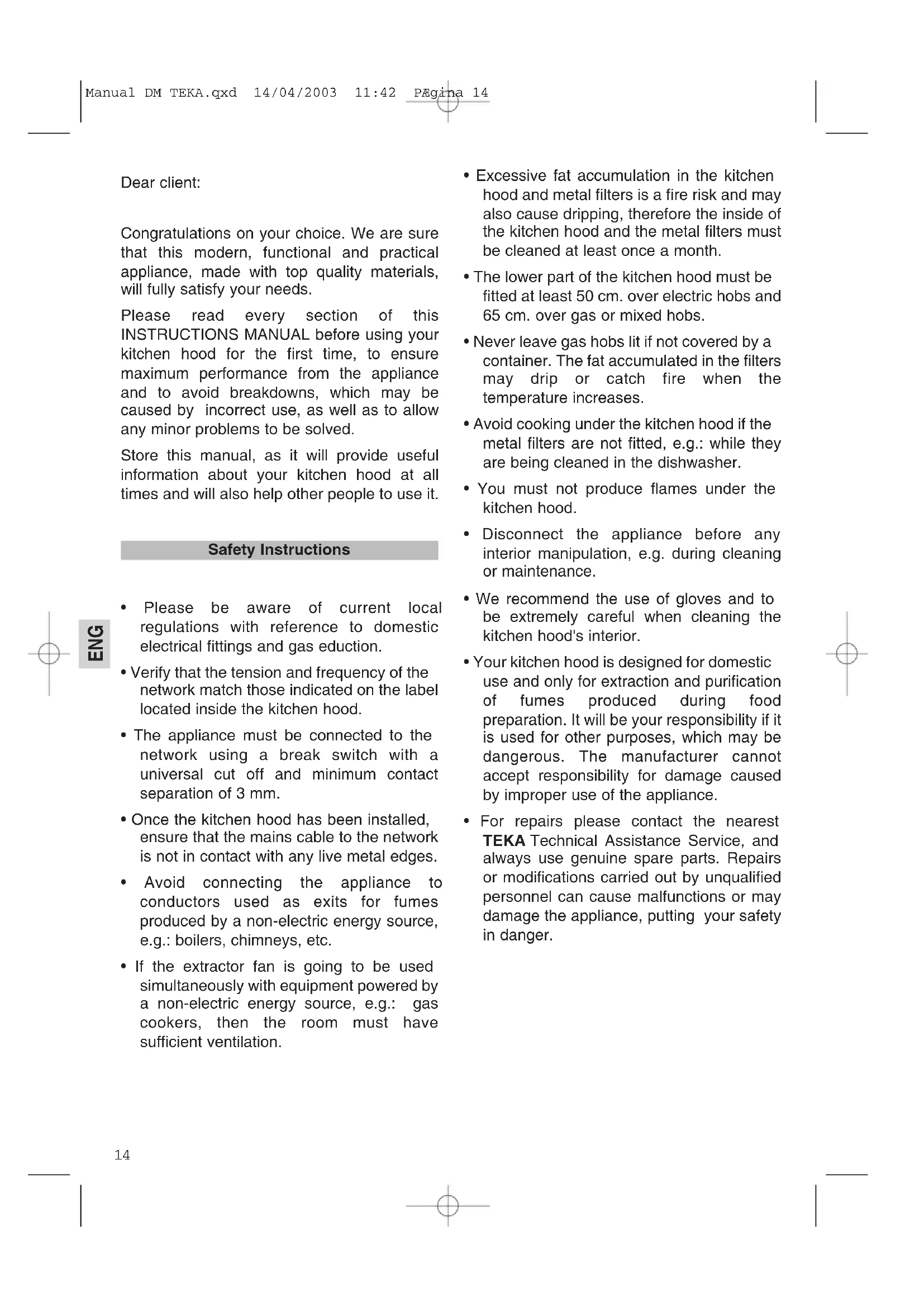 FIG. 2 FIG. 3 FIG.1 Manual DM TEKA.qxd 14/04/2003 11:42 PÆgina 1314 ENG Dear client: Congratulations on your choice. We are sure that this modern, functional and practical appliance, made with top quality materials, will fully satisfy your needs. Please read every section of this INSTRUCTIONS MANUAL before using your kitchen hood for the first time, to ensure maximum performance from the appliance and to avoid breakdowns, which may be caused by incorrect use, as well as to allow any minor problems to be solved. Store this manual, as it will provide useful information about your kitchen hood at all times and will also help other people to use it.