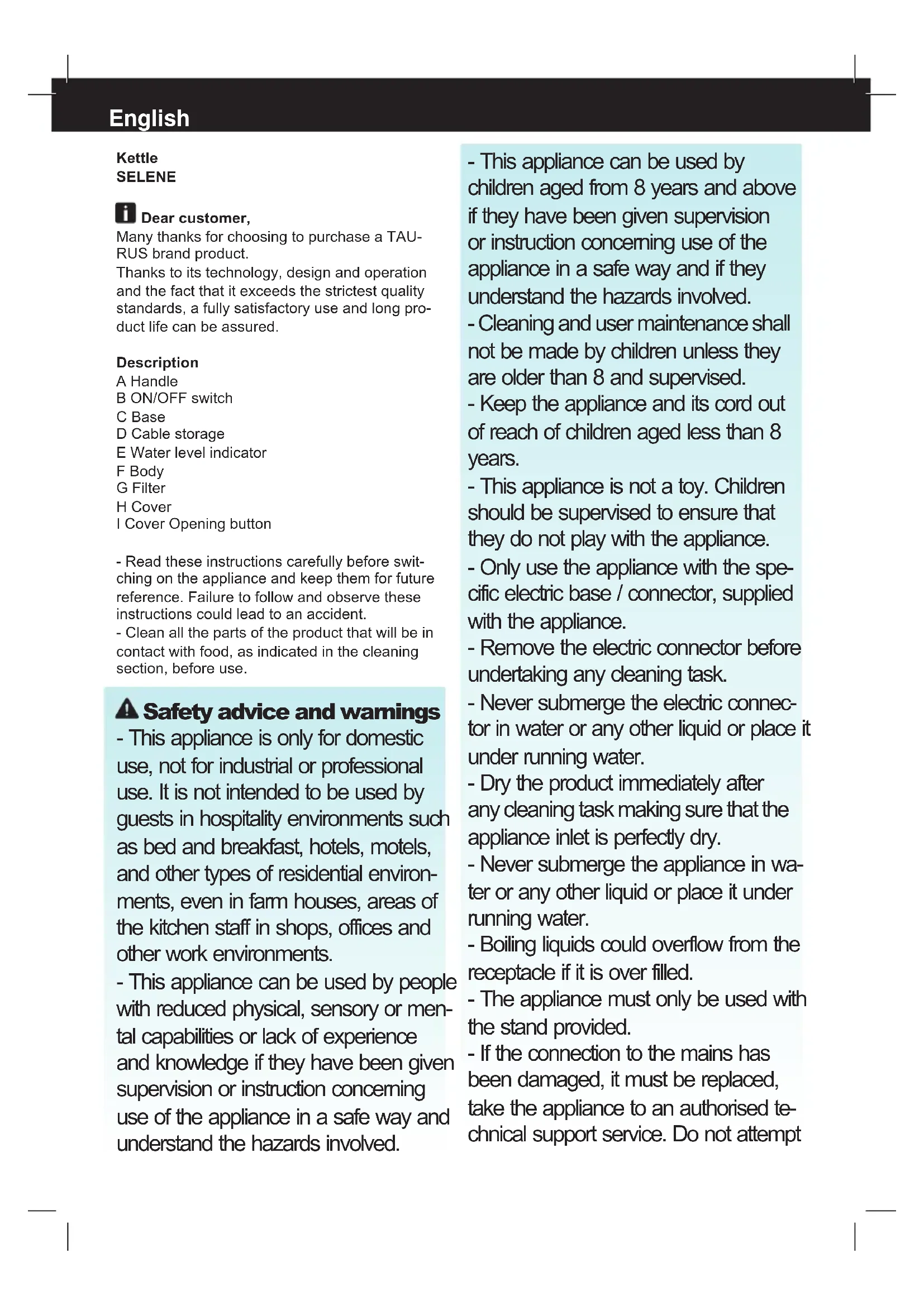 Selene - Kettle TAURUS - Free user manual and instructions