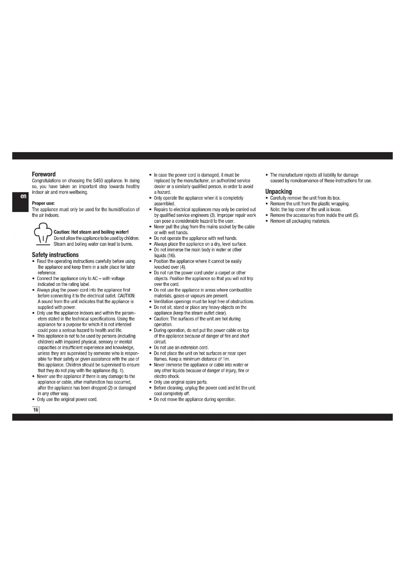 Foreword Congratulations on choosing the S450 appliance. In doing so, you have taken an important step towards healthy indoor air and more wellbeing. Proper use: The appliance must only be used for the humidification of the air indoors. Caution: Hot steam and boiling water! Do not allow the appliance to be used by children. Steam and boiling water can lead to burns. Safety instructions