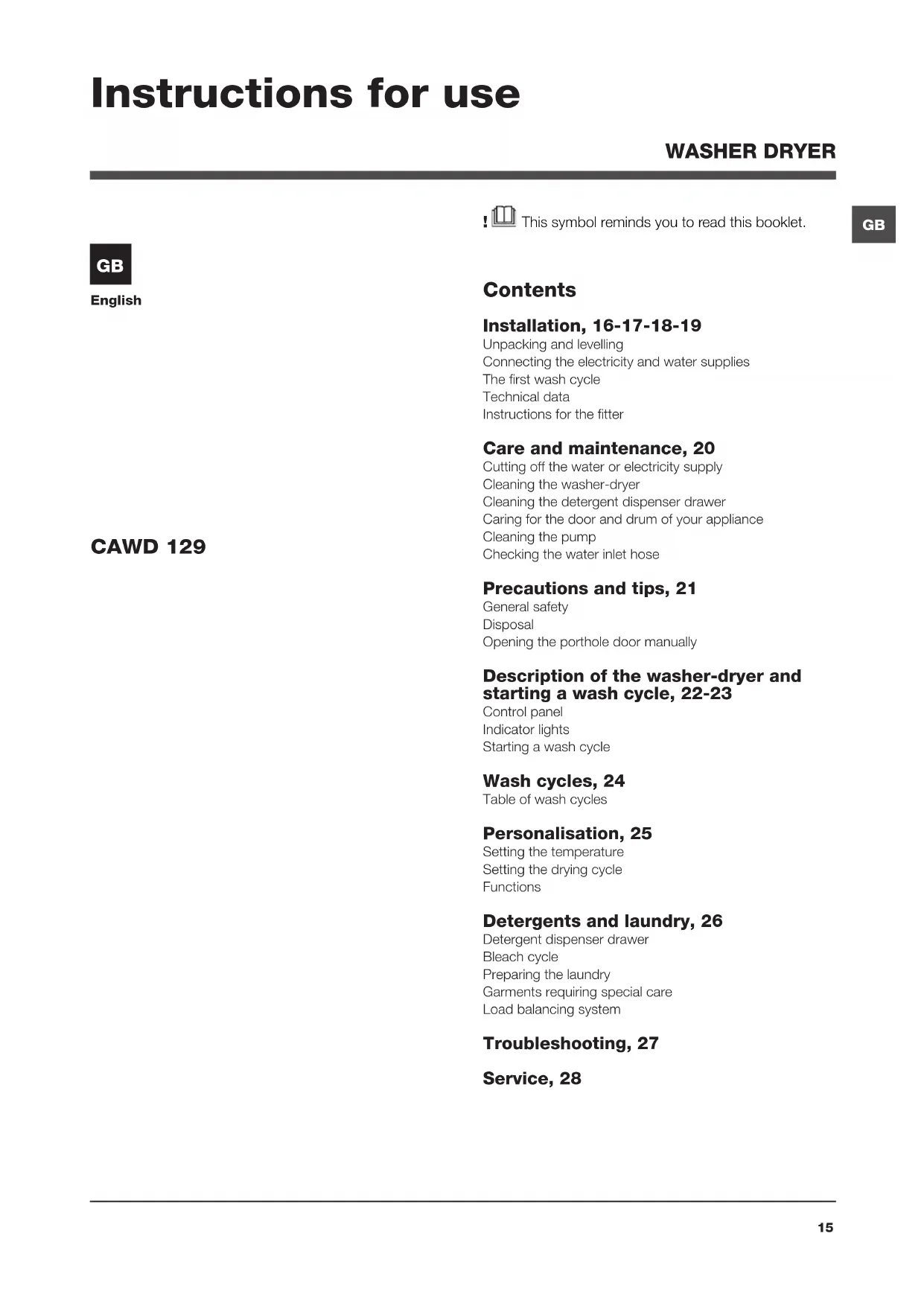 English ! This symbol reminds you to read this booklet. Contents Installation, 16-17-18-19 Unpacking and levellingConnecting the electricity and water suppliesThe first wash cycleTechnical dataInstructions for the fitter Care and maintenance, 20 Cutting off the water or electricity supplyCleaning the washer-dryerCleaning the detergent dispenser drawerCaring for the door and drum of your applianceCleaning the pumpChecking the water inlet hose Precautions and tips, 21 General safetyDisposalOpening the porthole door manually Description of the washer-dryer and starting a wash cycle, 22-23 Control panelIndicator lightsStarting a wash cycle Wash cycles, 24 Table of wash cycles Personalisation, 25 Setting the temperatureSetting the drying cycleFunctions Detergents and laundry, 26 Detergent dispenser drawerBleach cyclePreparing the laundryGarments requiring special careLoad balancing system Troubleshooting, 27 Service, 28
