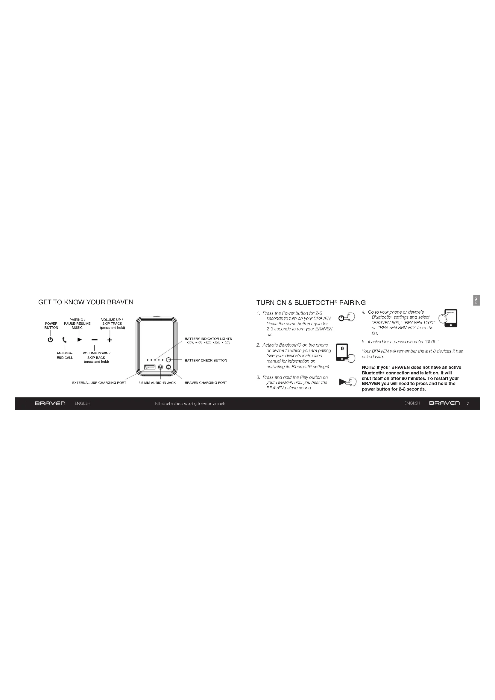 connection and is left on, it will shut itself o after 90 minutes. To restart your BRAVEN you will need to press and hold the power button for 2-3 seconds.3