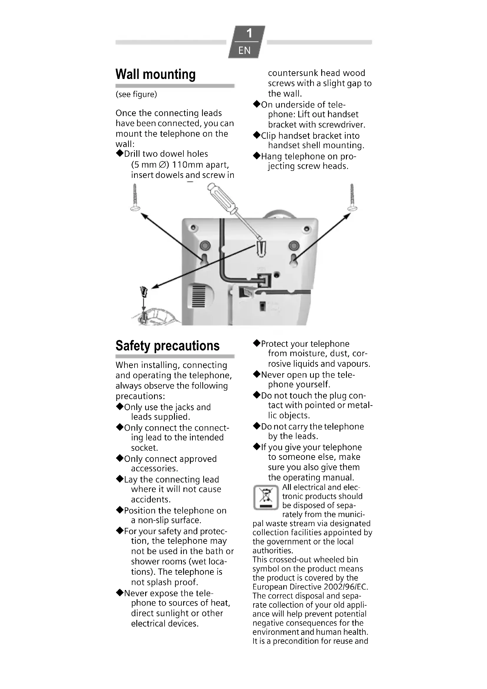 Wall mounting (see figure) Once the connecting leads have been connected, you can mount the telephone on the wall: ◆ Drill two dowel holes (5 mm ∅) 110mm apart, insert dowels and screw in countersunk head wood screws with a slight gap to the wall. ◆ On underside of tele- phone: Lift out handset bracket with screwdriver. ◆ Clip handset bracket into handset shell mounting. ◆ Hang telephone on pro- jecting screw heads. Safety precautions When installing, connecting and operating the telephone, always observe the following precautions: ◆ Only use the jacks and leads supplied. ◆ Only connect the connect- ing lead to the intended socket. ◆ Only connect approved accessories. ◆ Lay the connecting lead where it will not cause accidents. ◆ Position the telephone on a non-slip surface. ◆ For your safety and protec- tion, the telephone may not be used in the bath or shower rooms (wet loca- tions). The telephone is not splash proof. ◆ Never expose the tele- phone to sources of heat, direct sunlight or other electrical devices. ◆ Protect your telephone from moisture, dust, cor- rosive liquids and vapours. ◆ Never open up the tele- phone yourself. ◆ Do not touch the plug con- tact with pointed or metal- lic objects. ◆ Do not carry the telephone by the leads. ◆ If you give your telephone to someone else, make sure you also give them the operating manual. All electrical and elec-tronic products should be disposed of sepa-rately from the munici-pal waste stream via designated collection facilities appointed by the government or the local authorities.This crossed-out wheeled bin symbol on the product means the product is covered by the European Directive 2002/96/EC.The correct disposal and sepa-rate collection of your old appli-ance will help prevent potential negative consequences for the environment and human health. It is a precondition for reuse and5005 / EU1 en-gr-cz / A30054-M6522-D801-2-UG19 / 5005.fm / 13.12.2005