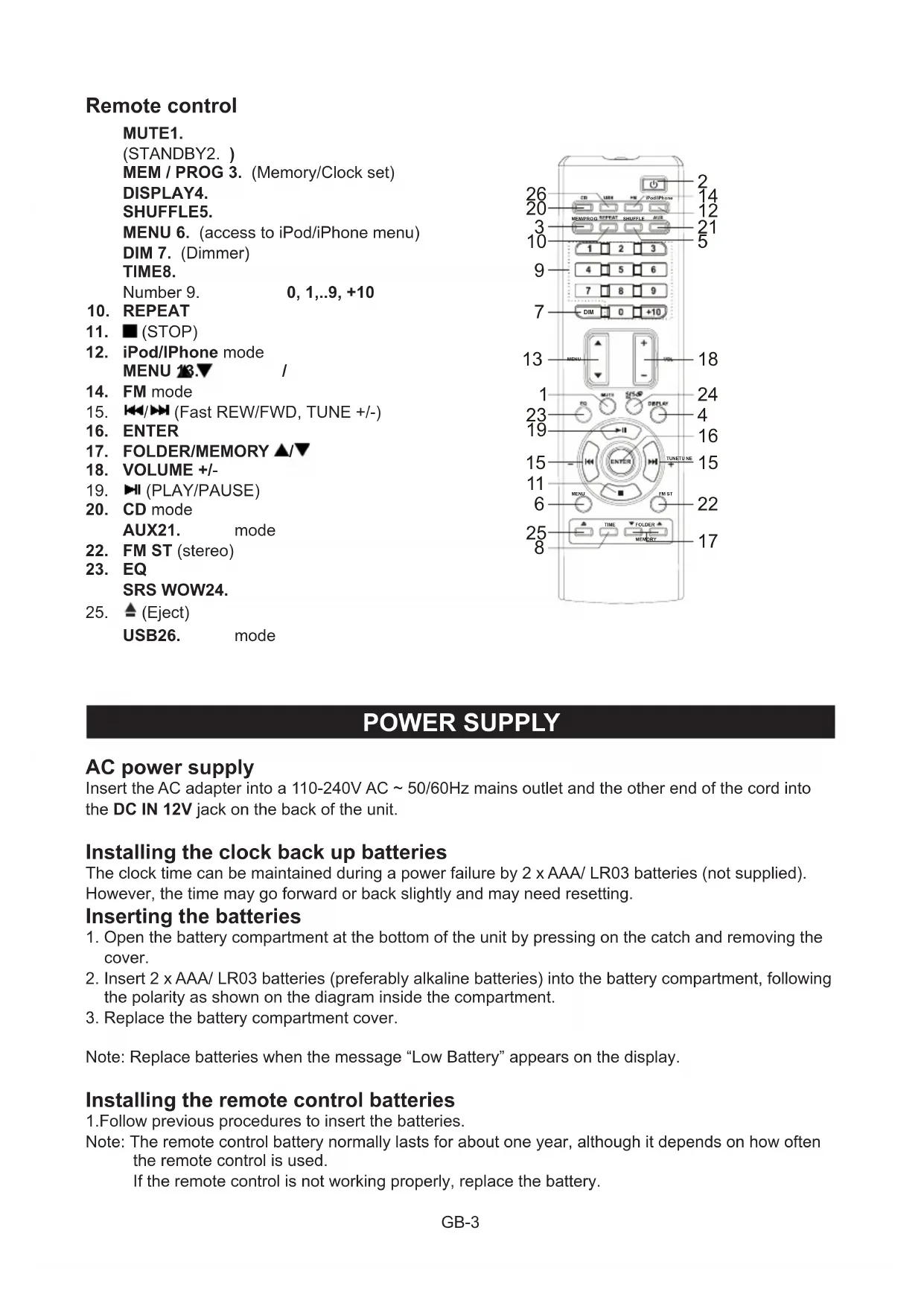 Clock back-up DC 3V (2 x 1.5V): 2 x AAA/LR03 batteries