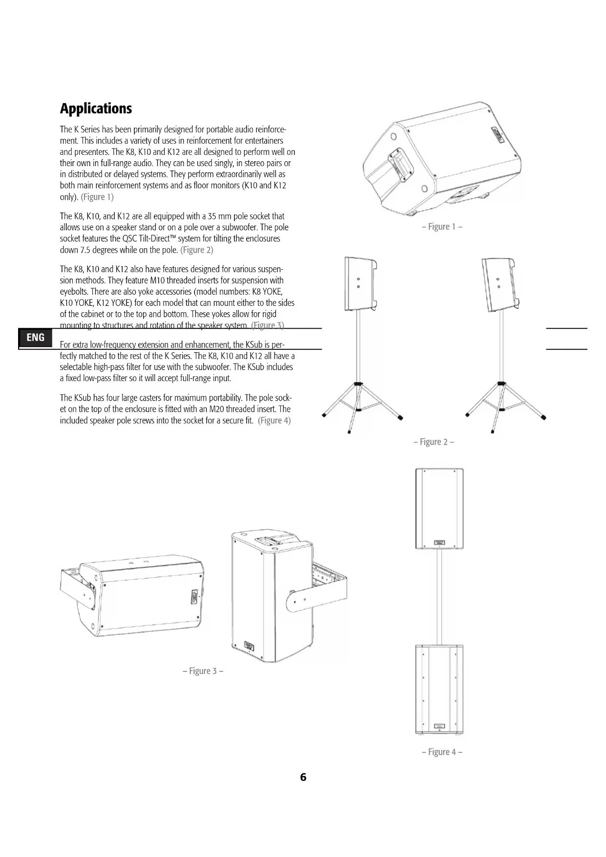 ENG ENG Applications The K Series has been primarily designed for portable audio reinforce- ment. This includes a variety of uses in reinforcement for entertainers and presenters. The K8, K10 and K12 are all designed to perform well on their own in full-range audio. They can be used singly, in stereo pairs or in distributed or delayed systems. They perform extraordinarily well as both main reinforcement systems and as floor monitors (K10 and K12 only). (Figure 1) The K8, K10, and K12 are all equipped with a 35 mm pole socket that allows use on a speaker stand or on a pole over a subwoofer. The pole socket features the QSC Tilt-Direct™ system for tilting the enclosures down 7.5 degrees while on the pole. (Figure 2) The K8, K10 and K12 also have features designed for various suspen- sion methods. They feature M10 threaded inserts for suspension with eyebolts. There are also yoke accessories (model numbers: K8 YOKE, K10 YOKE, K12 YOKE) for each model that can mount either to the sides of the cabinet or to the top and bottom. These yokes allow for rigid mounting to structures and rotation of the speaker system. (Figure 3) For extra low-frequency extension and enhancement, the KSub is per- fectly matched to the rest of the K Series. The K8, K10 and K12 all have a selectable high-pass filter for use with the subwoofer. The KSub includes a fixed low-pass filter so it will accept full-range input. The KSub has four large casters for maximum portability. The pole sock- et on the top of the enclosure is fitted with an M20 threaded insert. The included speaker pole screws into the socket for a secure fit. (Figure 4) – Figure 1 – – Figure 2 – – Figure 3 – – Figure 4 –6 ENG ENG