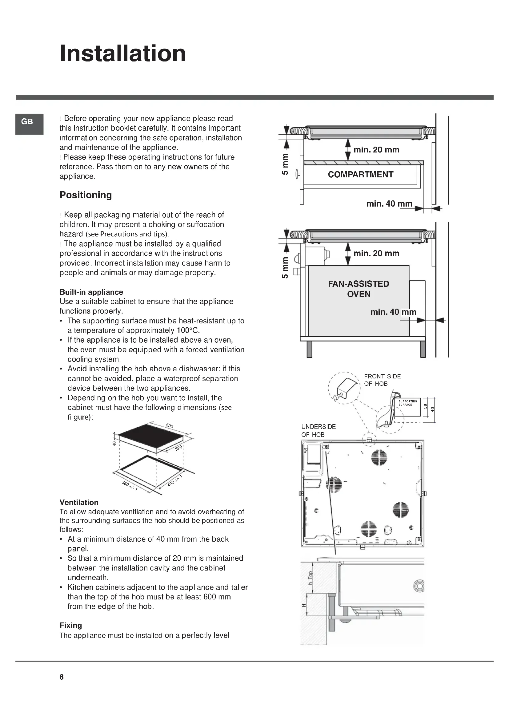 - Kitchen cabinets adjacent to the appliance and taller than the top of the hob must be at least 600 mm from the edge of the hob. Fixing The appliance must be installed on a perfectly level FRONT SIDE OF HOB SUPPORTING SURFACE