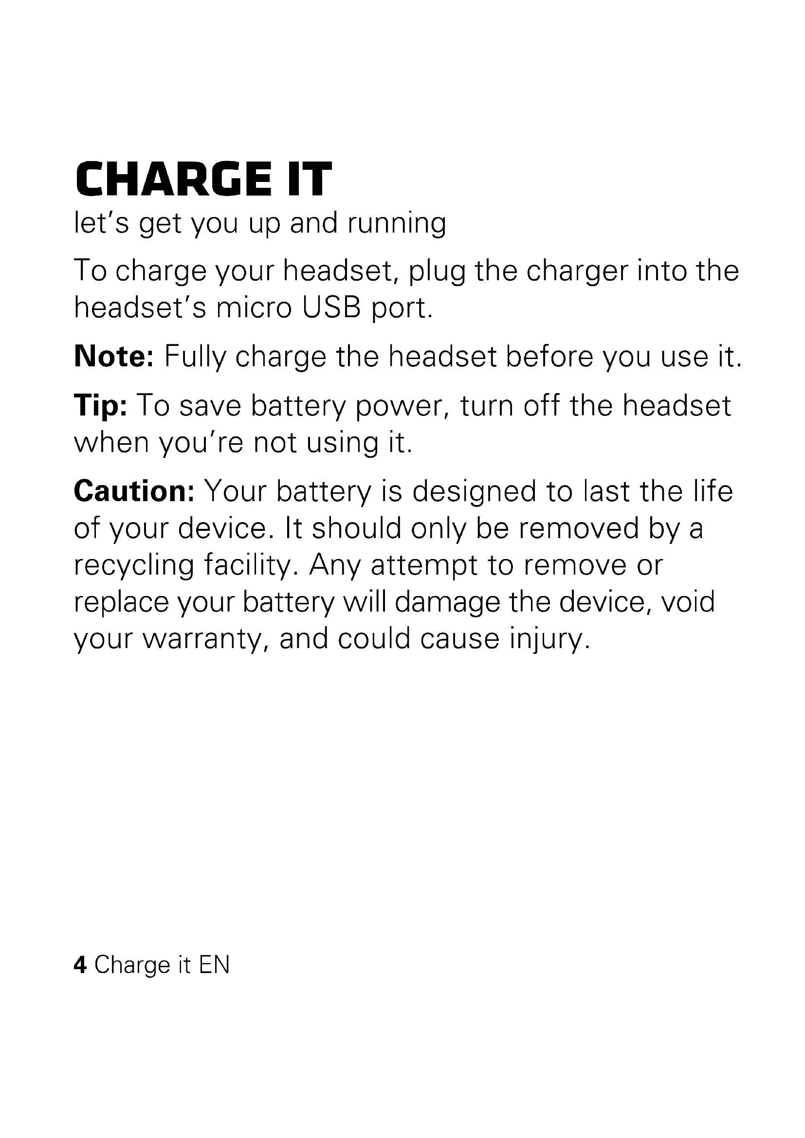 If your device doesn't support voice prompts, you'll hear a tone.6 Connect & go EN NFC method Use Near Field Communication (NFC) technology to pair your headset and device just by touching them together.EN Connect & go 7 1 Turn on Bluetooth® and NFC on your device. 2 Turn on your headset. 3 Touch the front side of the headset (with Call button) to the NFC reader location on the device (display must be on). The device notifies you when pairing is complete. Notes: