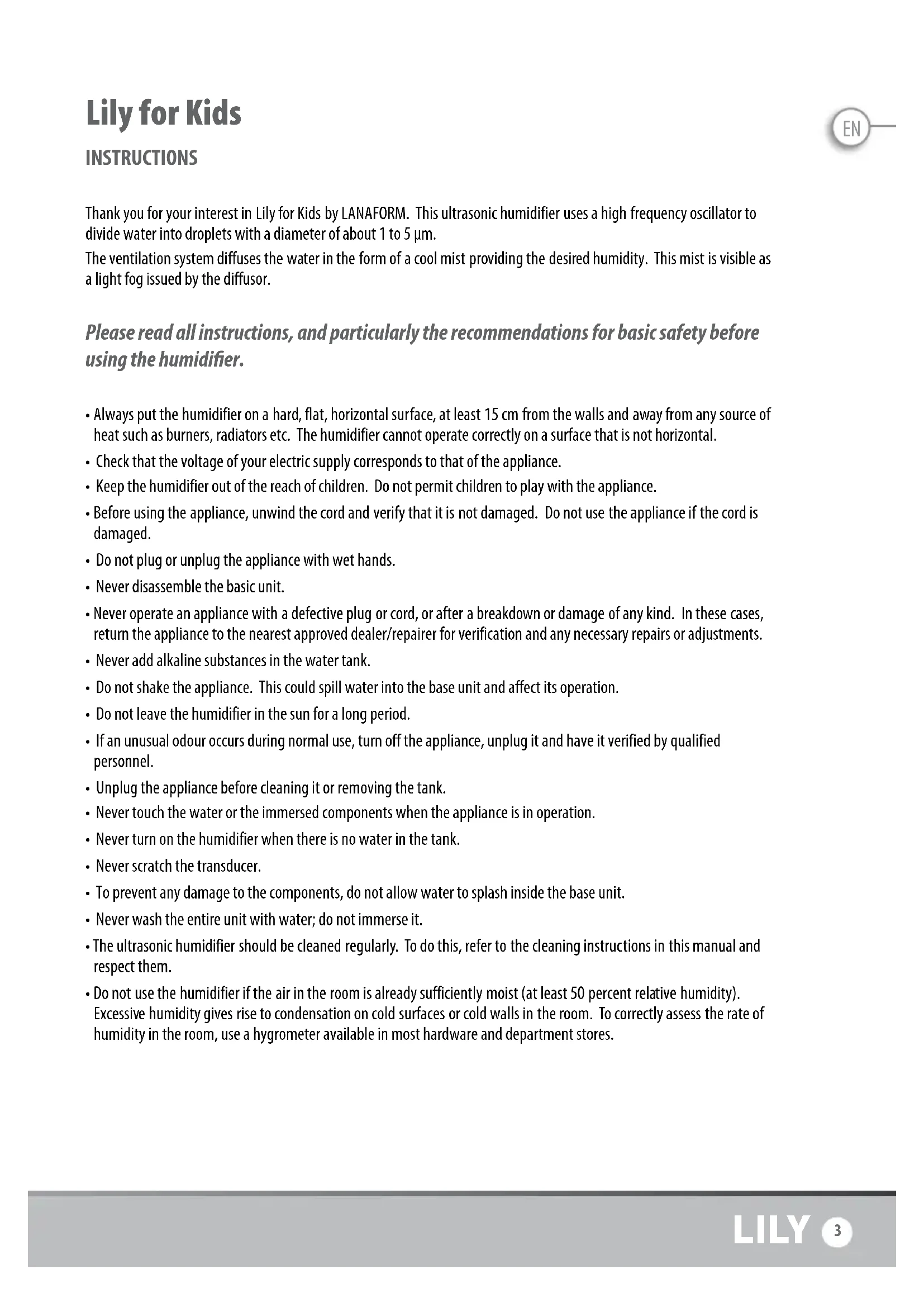 2EN Lily for Kids INSTRUCTIONS Thank you for your interest in Lily for Kids by LANAFORM. This ultrasonic humidifier uses a high frequency oscillator to divide water into droplets with a diameter of about 1 to 5 µm. The ventilation system diffuses the water in the form of a cool mist providing the desired humidity. This mist is visible as a light fog issued by the diffusor. Please read all instructions, and particularly the recommendations for basic safety before using the humidifier.