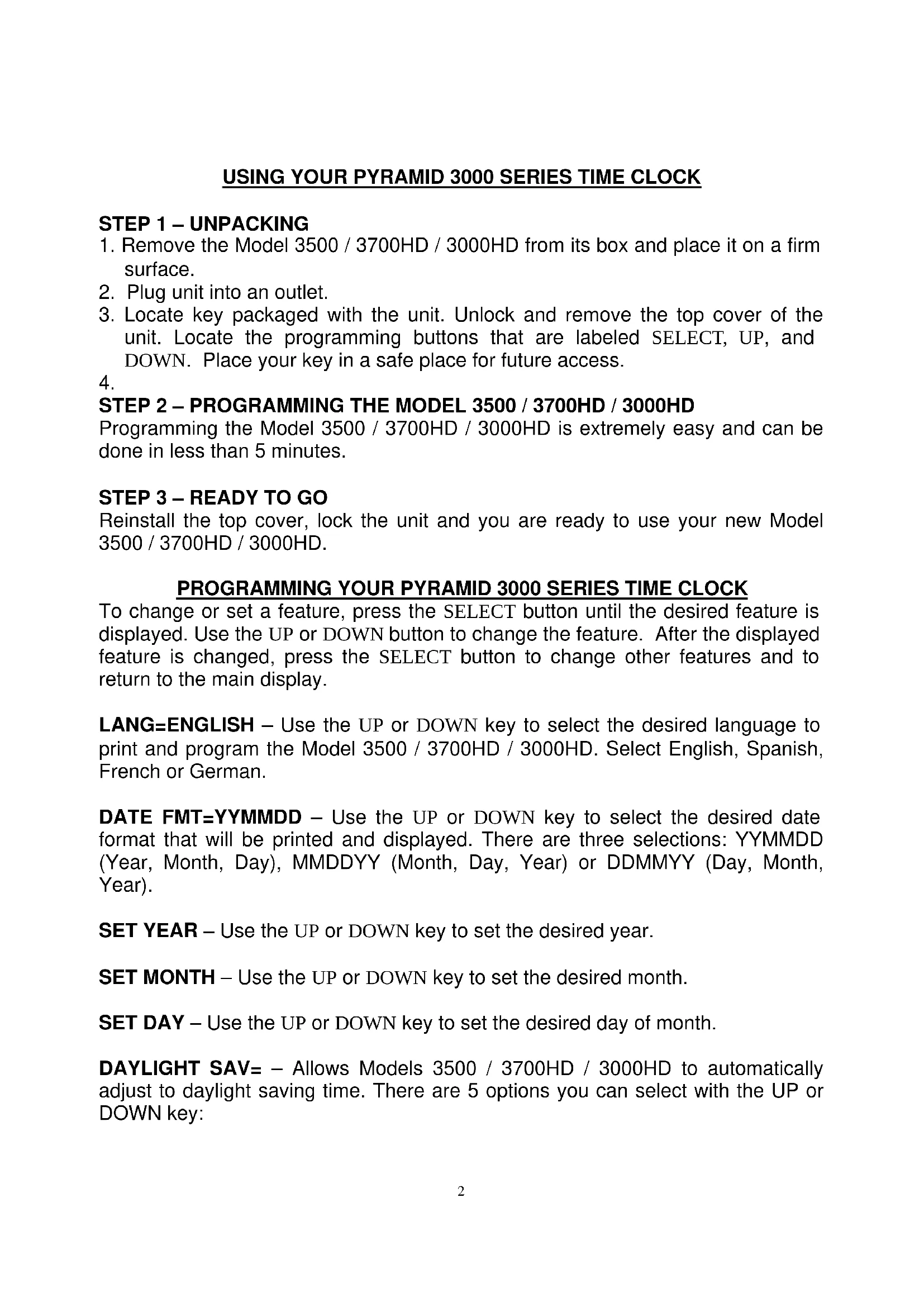 To change or set a feature, press the SELECT button until the desired feature is displayed. Use the UP or DOWN button to change the feature. After the displayed feature is changed, press the SELECT button to change other features and to return to the main display. LANG=ENGLISH – Use the UP or DOWN key to select the desired language to print and program the Model 3500 / 3700HD / 3000HD. Select English, Spanish, French or German. DATE FMT=YYMMDD – Use the UP or DOWN key to select the desired date format that will be printed and displayed. There are three selections: YYMMDD (Year, Month, Day), MMDDYY (Month, Day, Year) or DDMMYY (Day, Month, Year). SET YEAR – Use the UP or DOWN key to set the desired year. SET MONTH – Use the UP or DOWN key to set the desired month. SET DAY – Use the UP or DOWN key to set the desired day of month. DAYLIGHT SAV= – Allows Models 3500 / 3700HD / 3000HD to automatically adjust to daylight saving time. There are 5 options you can select with the UP or DOWN key: 2USA07+ Automatically adjusts time to 2007 United States daylight saving time (starts Second Sunday of March and ends First Sunday of November). USA06- Automatically adjusts time to Pre-2007 United States daylight saving time (starts First Sunday of April and ends Last Sunday of October). EURO Automatically adjusts time to European daylight saving time. (Begins last Sunday in March and ends on the last Sunday in October). OTHER Allows you to select a custom start and end Sunday for automatic daylight saving time changes. After SELECTING OTHER, use the UP or DOWN key to select the desired Sunday (only Sundays are allowed) you wish to START daylight saving time, press SELECT and again use the UP or DOWN key to select the desired Sunday to END daylight saving time. Note: The time will automatically change at 2 a.m. on the selected Sundays. OFF- Unit will not adjust time for daylight saving time. TIME STD=LINE. This option should only be changed for areas outside of the U.S.A where there is frequency variation in the power lines. If you are operating this unit in an area that has problems with power line frequency resulting in the unit losing or gaining time or you are running the unit off a generator/inverter, use the UP or DOWN key to change the TIME STD to CRYSTAL which will cause the unit to keep time using an internal device. DSPLY FMT=AM/PM – Selects how the time will be displayed on the front of the unit. Using the UP or DOWN keys, select one of the following options:
